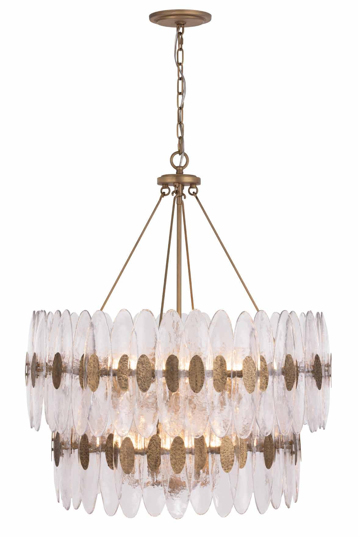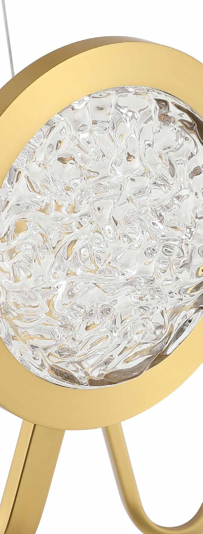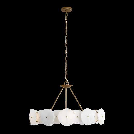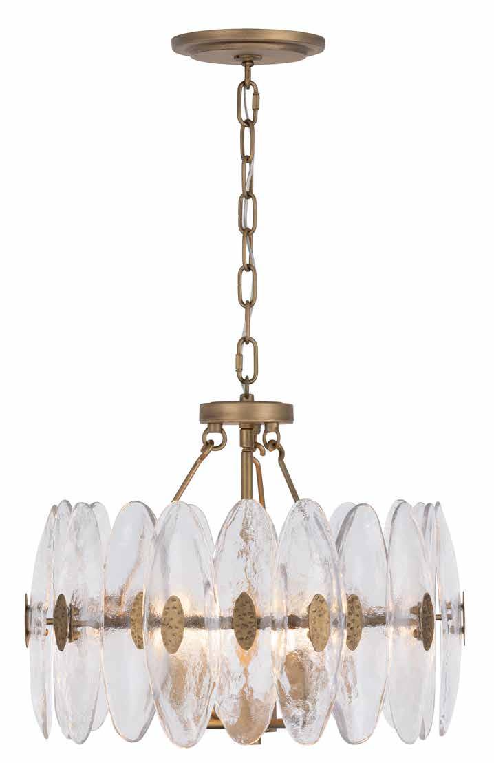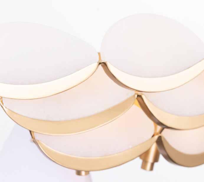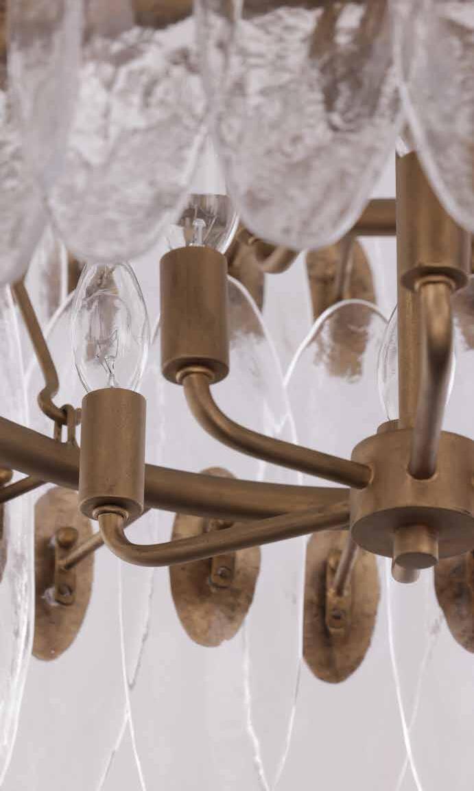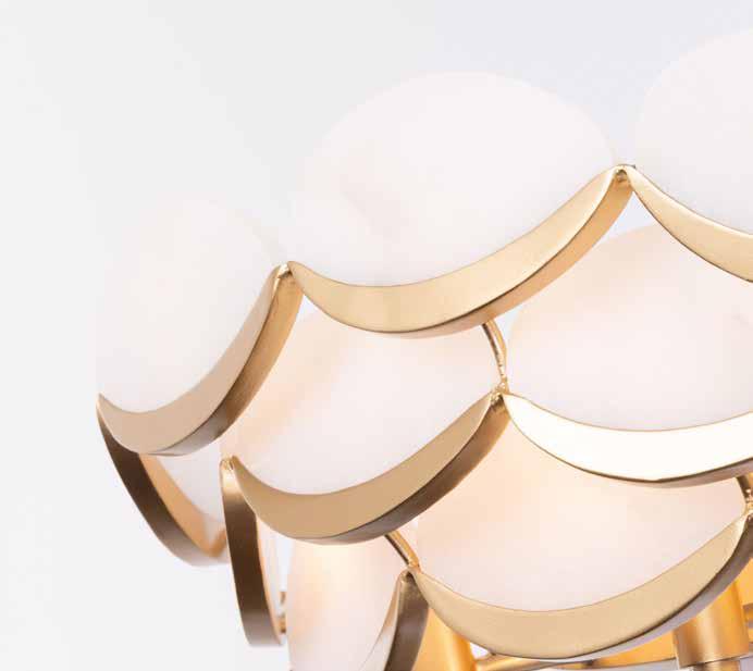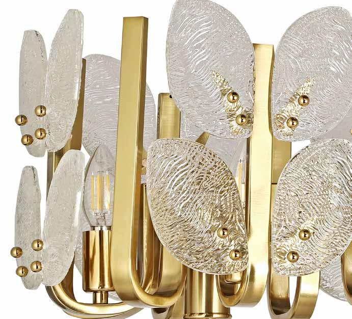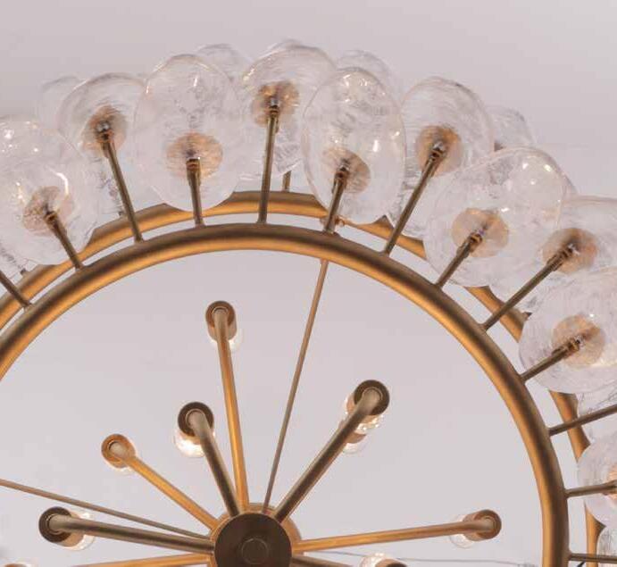 LIKE THE SHIMMERING WAVES OF DAWN THAT INSPIRED ITS NAME, AURORA BATHES EVERY ROOM IN A SOFT, GOLDEN GLOW. LAYERED OVAL GLASS DISCS—EACH TEXTURED TO CATCH AND SCATTER LIGHT—SURROUND A WARM BRASS FRAME, CREATING A RADIANT HALO OF STYLE AND SOPHISTICATION. INSPIRED BY MID-CENTURY MURANO GLASS DESIGNS, AURORA IS THE PERFECT BALANCE OF VINTAGE GLAM AND MODERN REFINEMENT.