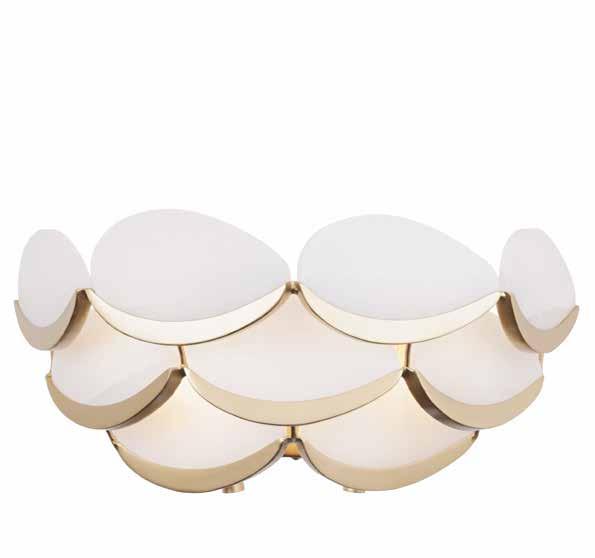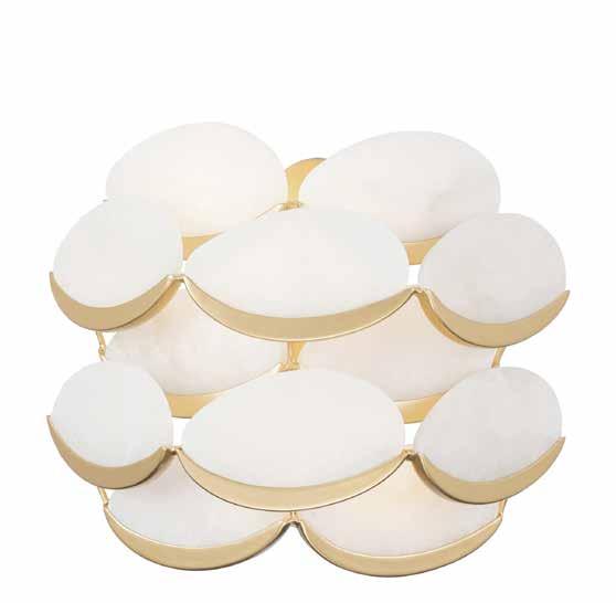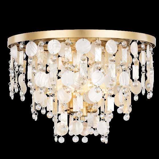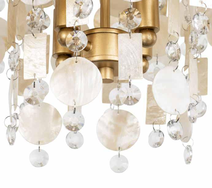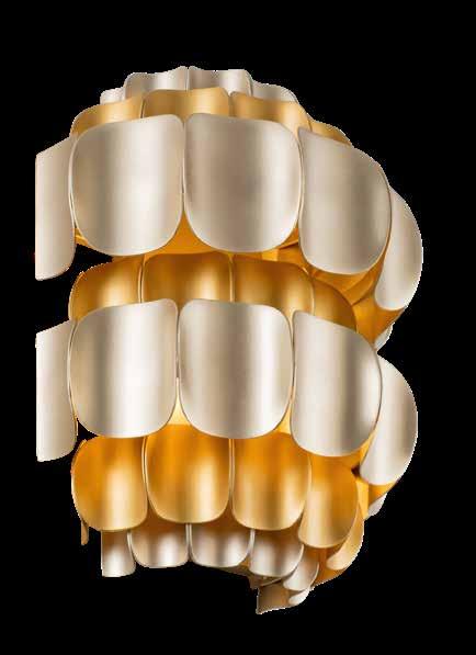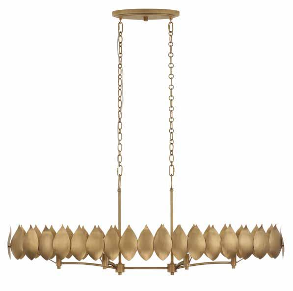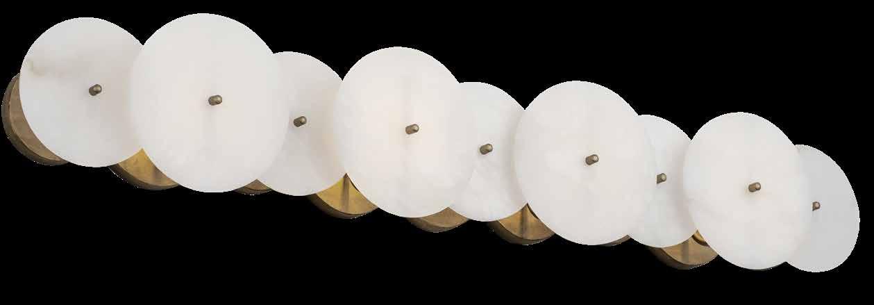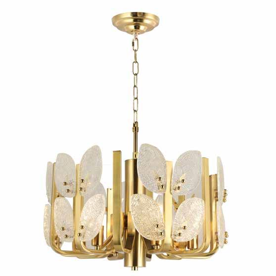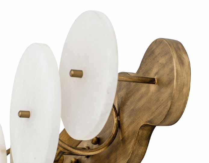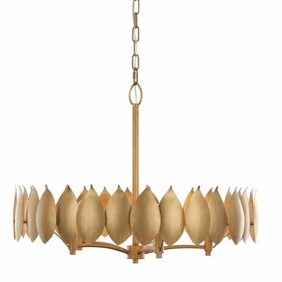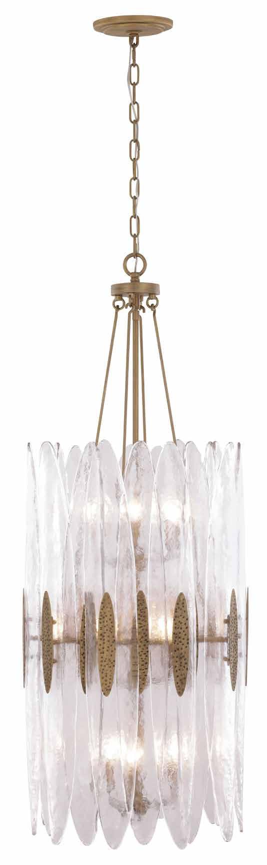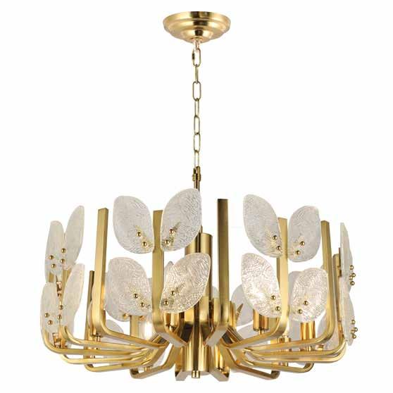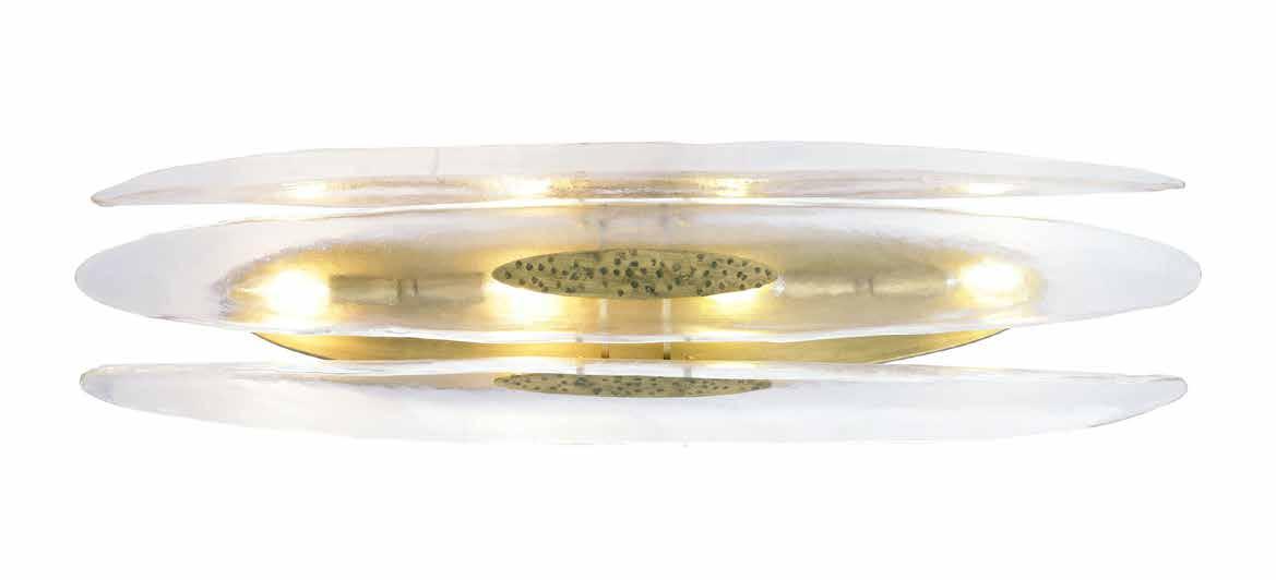 LIKE THE SHIMMERING WAVES OF DAWN THAT INSPIRED ITS NAME, AURORA BATHES EVERY ROOM IN A SOFT, GOLDEN GLOW. LAYERED OVAL GLASS DISCS—EACH TEXTURED TO CATCH AND SCATTER LIGHT—SURROUND A WARM BRASS FRAME, CREATING A RADIANT HALO OF STYLE AND SOPHISTICATION. INSPIRED BY MID-CENTURY MURANO GLASS DESIGNS, AURORA IS THE PERFECT BALANCE OF VINTAGE GLAM AND MODERN REFINEMENT.