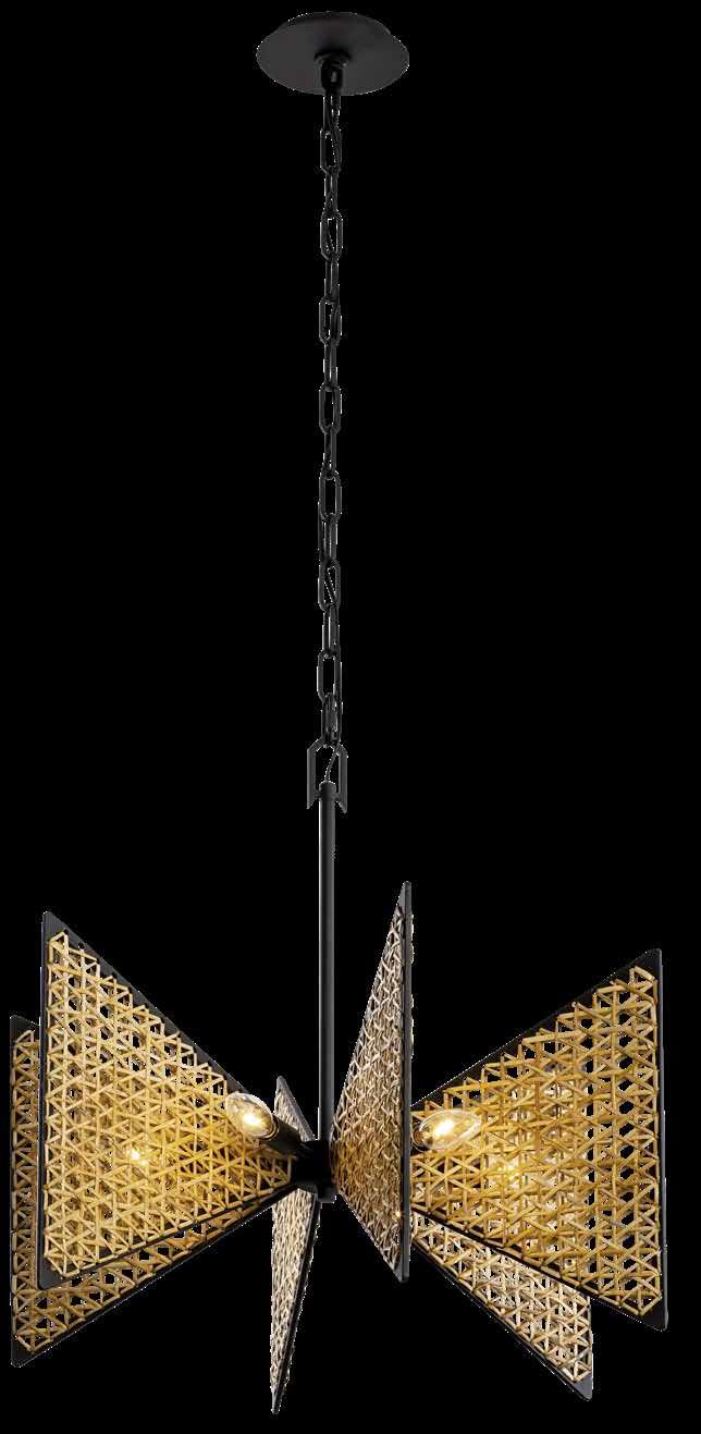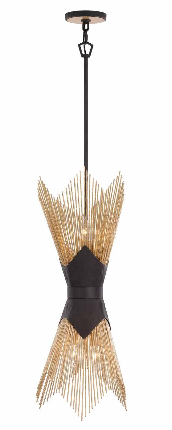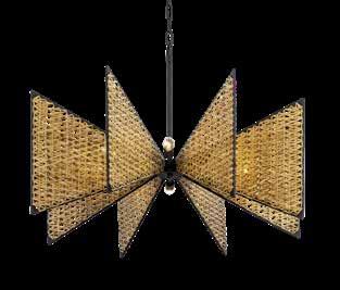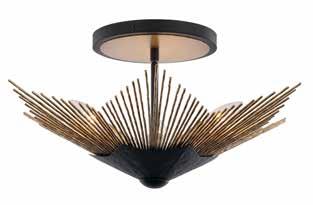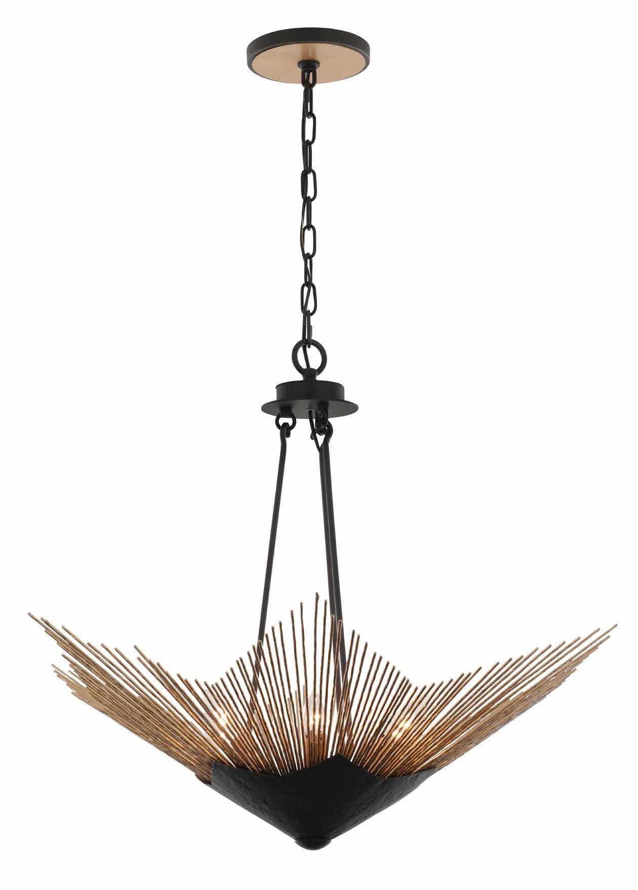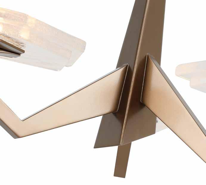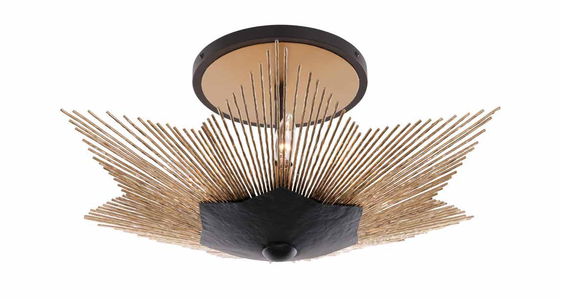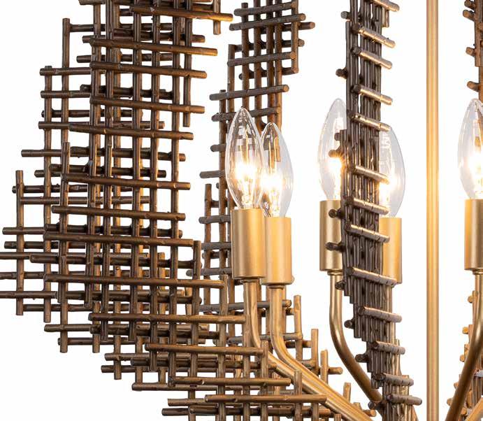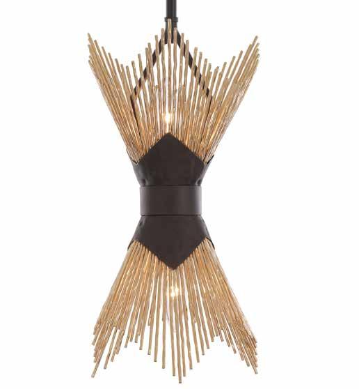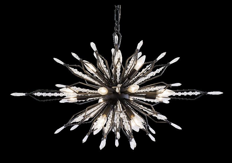 COMMANDING ATTENTION WITH THE CONFIDENCE OF COSMIC ROYALTY, ARISTOCRAT CHANNELS THE GLAMOUR OF ART DECO THROUGH A SUPERNOVA OF STRUCTURE. ITS DIMENSIONAL SIX-POINTED STAR MOTIF BURSTS FORWARD IN RADIANT FORM, WHILE HAND-HAMMERED SPINDLE— LIKE SOLAR FLARES FROZEN MID-GLOW— ALLOW LIGHT TO SHIMMER AND DANCE THROUGH. FINISHED IN A STATELY MIX OF HAND-APPLIED DARK BRONZE AND AGED GOLD, ARISTOCRAT IS BORN TO REIGN OVER ANY ROOM WITH A BALANCE OF DRAMA, DETAIL, AND DECO DIVINITY.