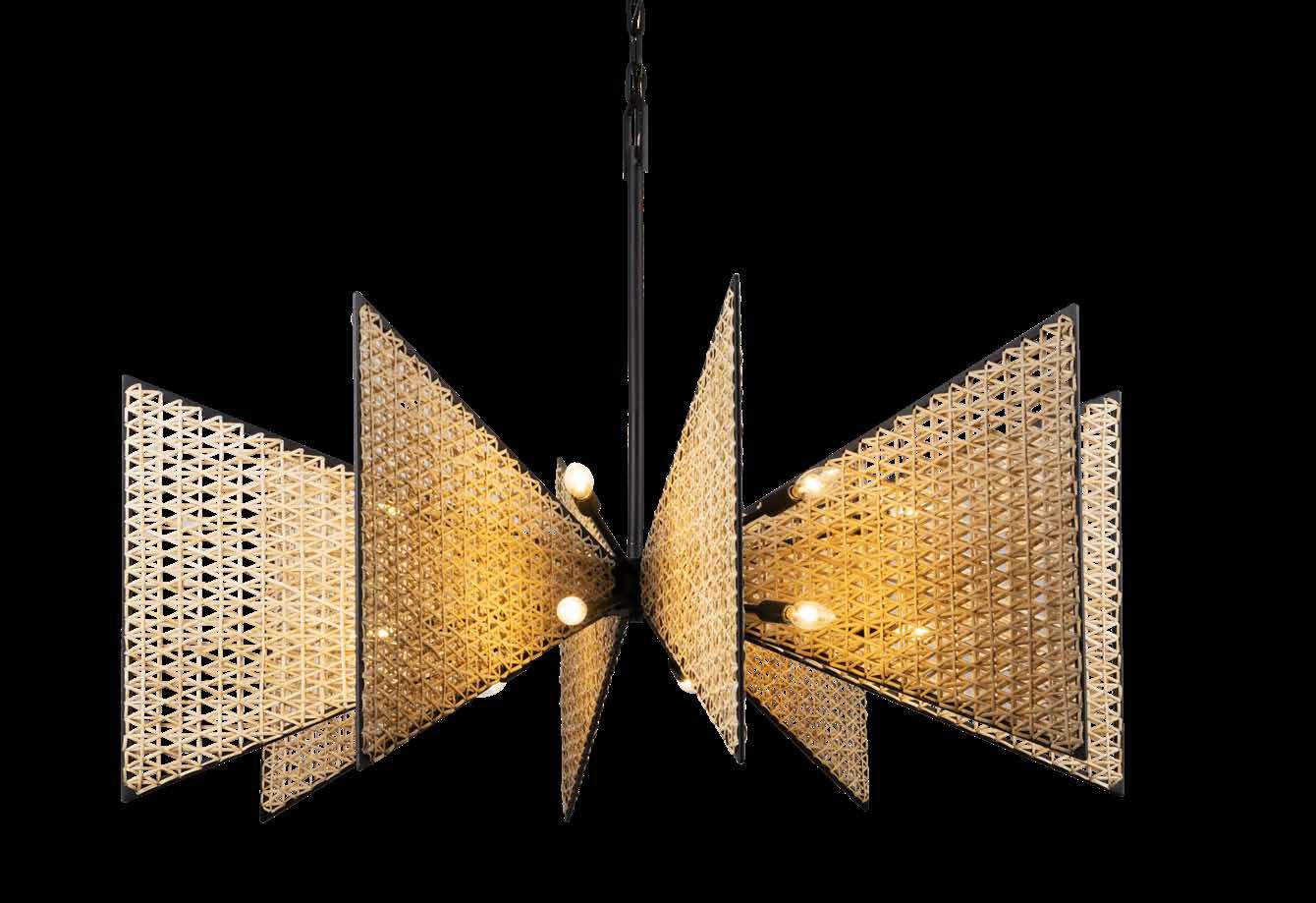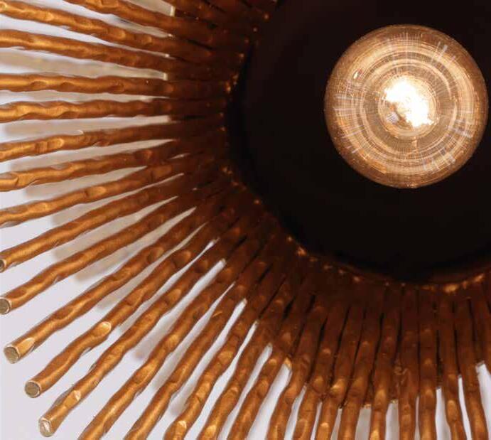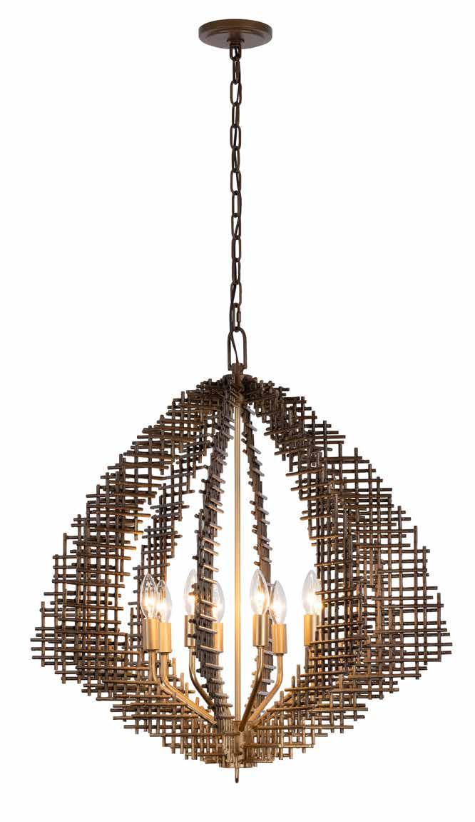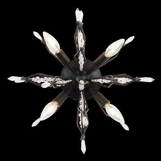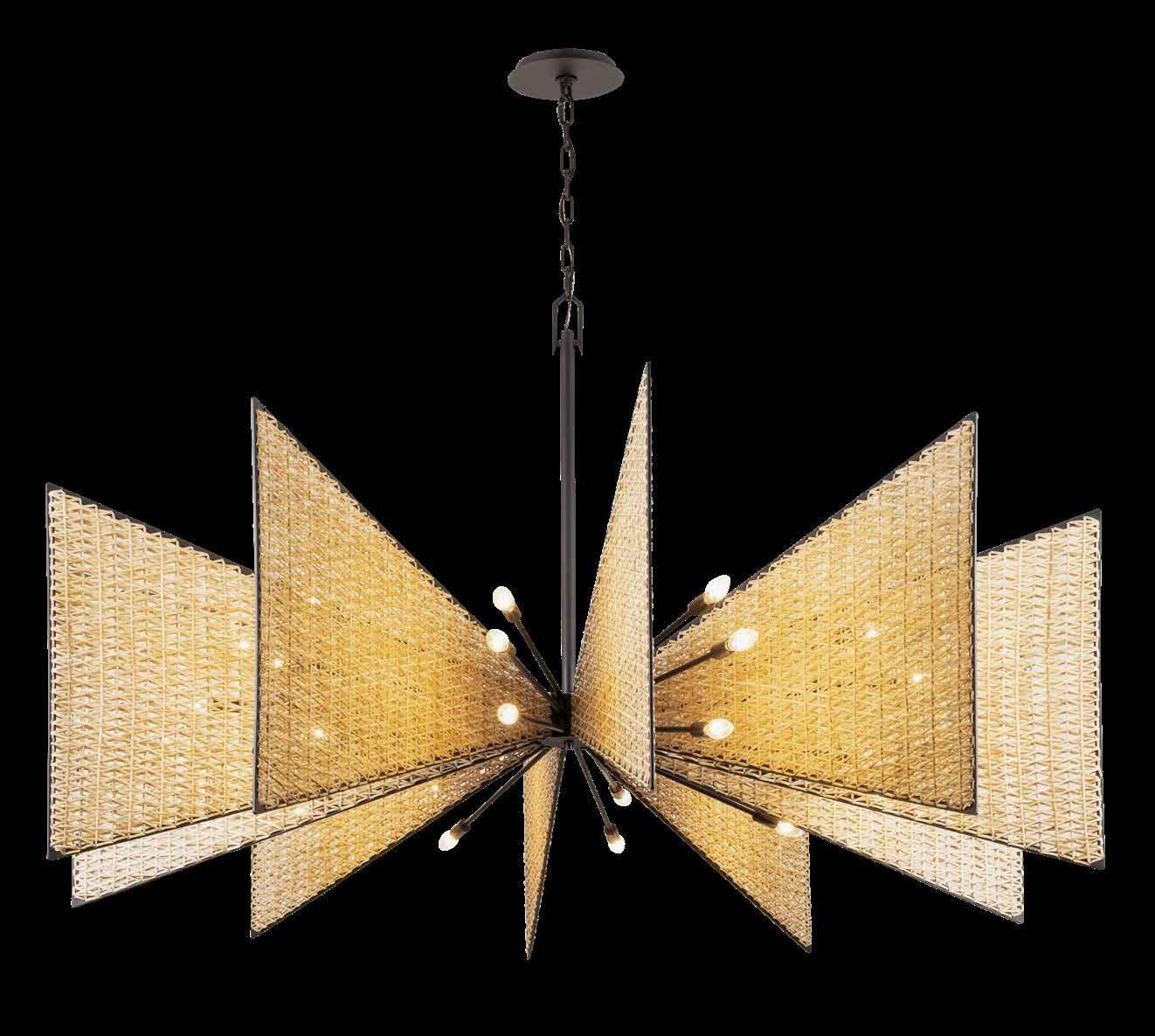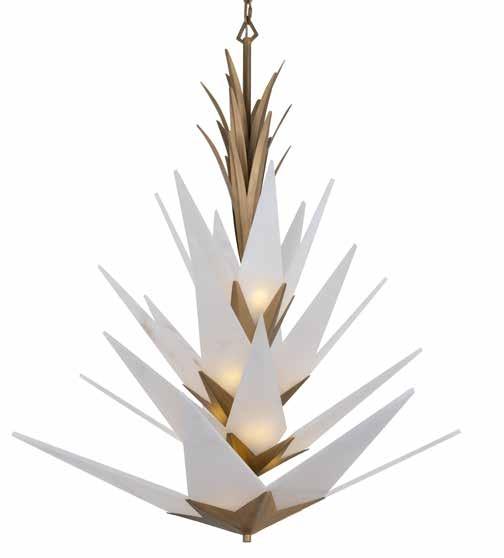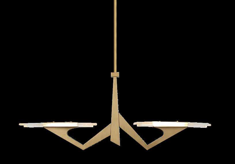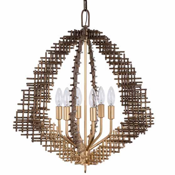 COMMANDING ATTENTION WITH THE CONFIDENCE OF COSMIC ROYALTY, ARISTOCRAT CHANNELS THE GLAMOUR OF ART DECO THROUGH A SUPERNOVA OF STRUCTURE. ITS DIMENSIONAL SIX-POINTED STAR MOTIF BURSTS FORWARD IN RADIANT FORM, WHILE HAND-HAMMERED SPINDLE— LIKE SOLAR FLARES FROZEN MID-GLOW— ALLOW LIGHT TO SHIMMER AND DANCE THROUGH. FINISHED IN A STATELY MIX OF HAND-APPLIED DARK BRONZE AND AGED GOLD, ARISTOCRAT IS BORN TO REIGN OVER ANY ROOM WITH A BALANCE OF DRAMA, DETAIL, AND DECO DIVINITY.