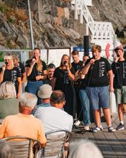 Under musikturnéerna sjunger och spelar Elida såväl från Elidas däck som på bryggor och i kyrkor. (Bild från Fotö hamn.) Foto: Benjamin Sjöström/Elida