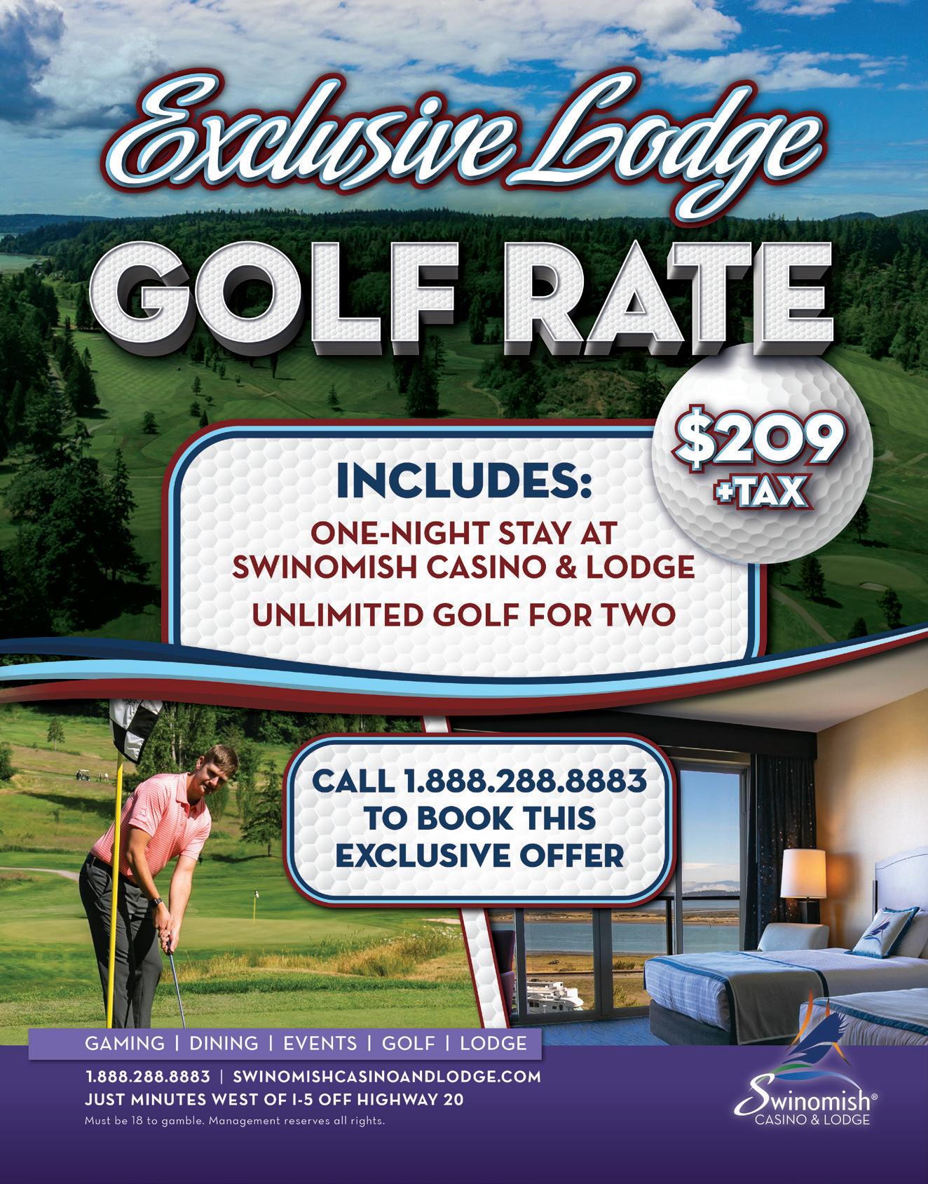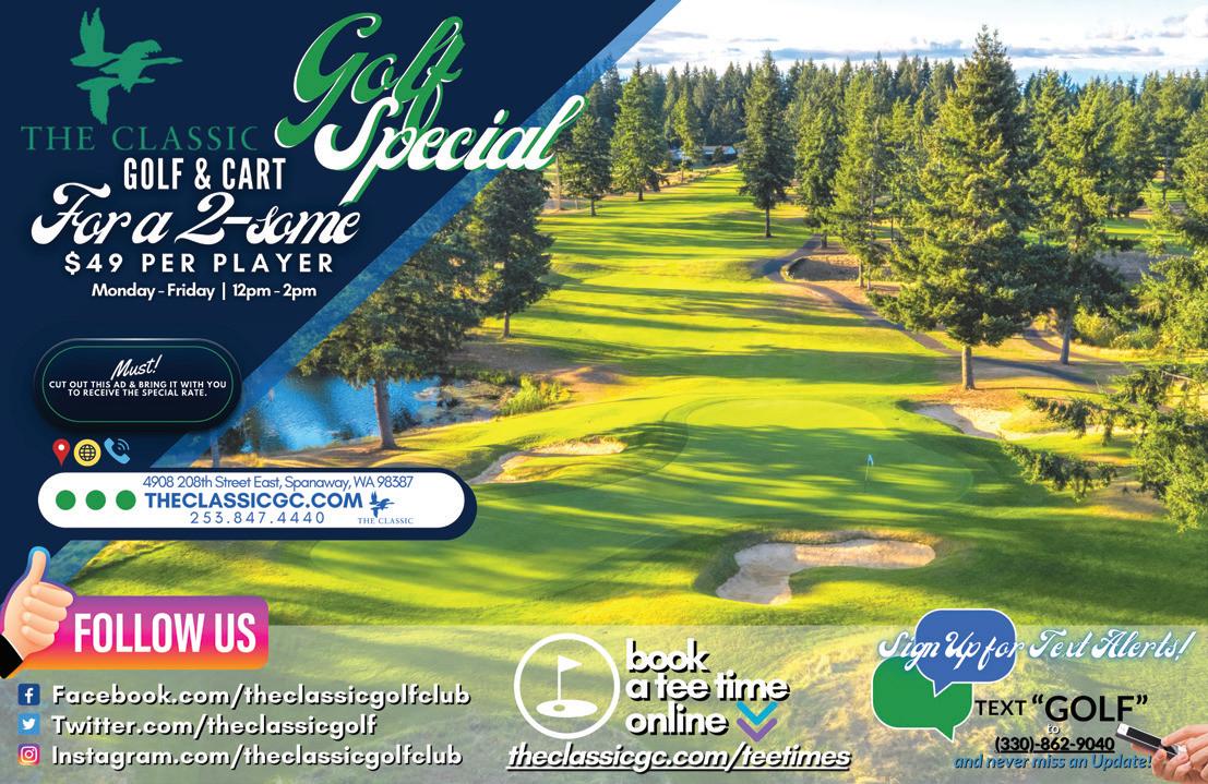 cascadegolfer.com 56 APRIL 2024 Luxurious Accommodations with Stay & Play Packages available Leavenworth’s Best Kept Secret kahlermountainclub.com • Conveniently located off Hwy 2, just 2 hours from Seattle • Aqua driving range • New 5 star onsite restaurant • Great Stay and Play Package Available Add a round to Kahler Mountain Club to any of your Central Washington Golf Road Trip! 20% OFF GREEN FEES Good Anytime Sun. - Fri. After 12:00 on Sat. Coupon must be presented to receive special offers