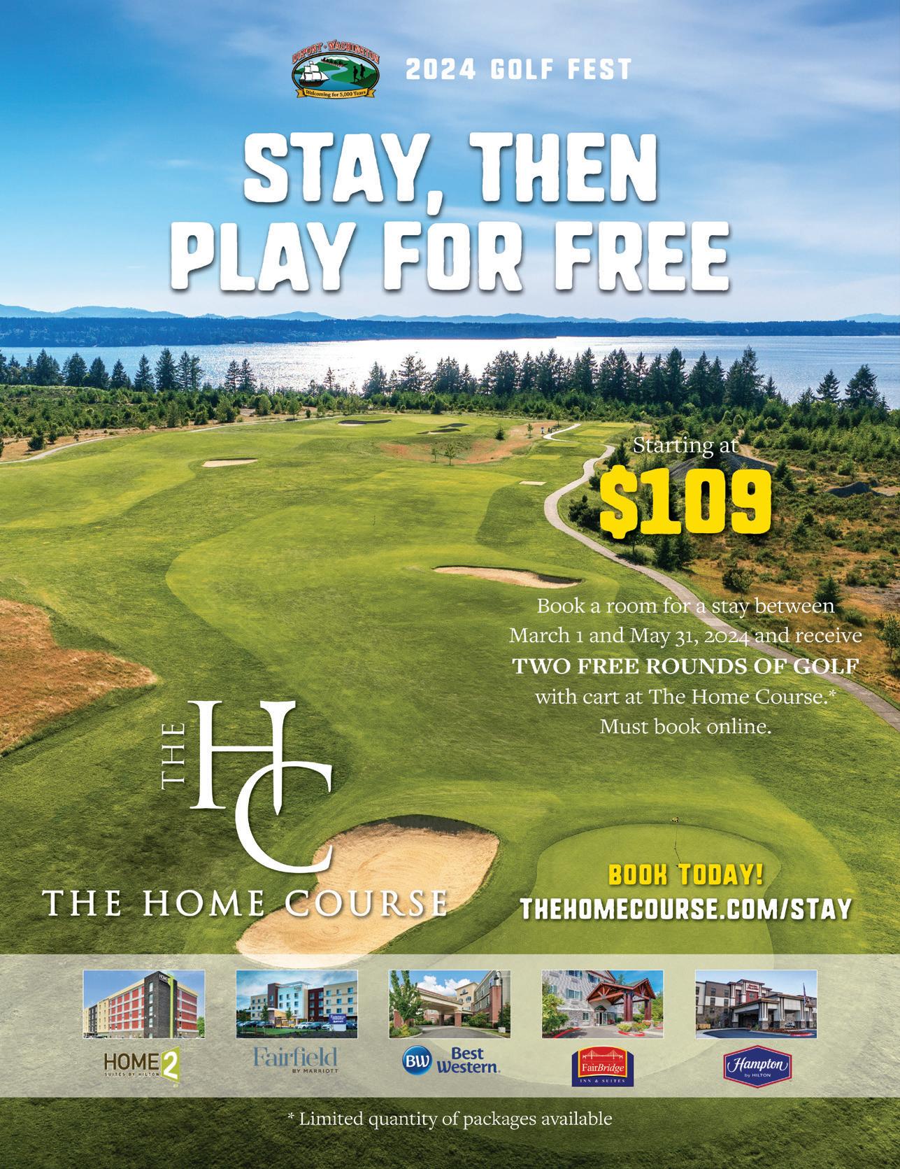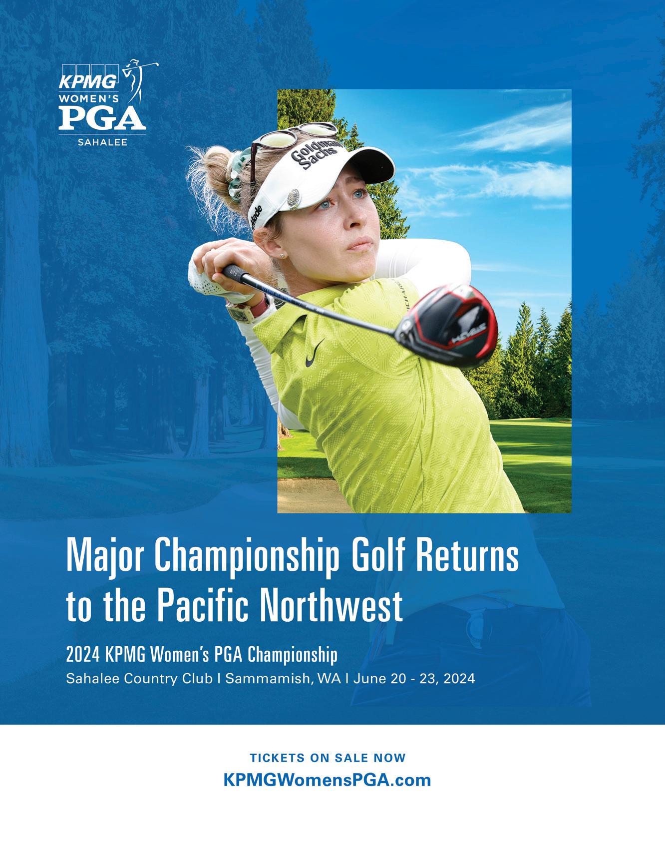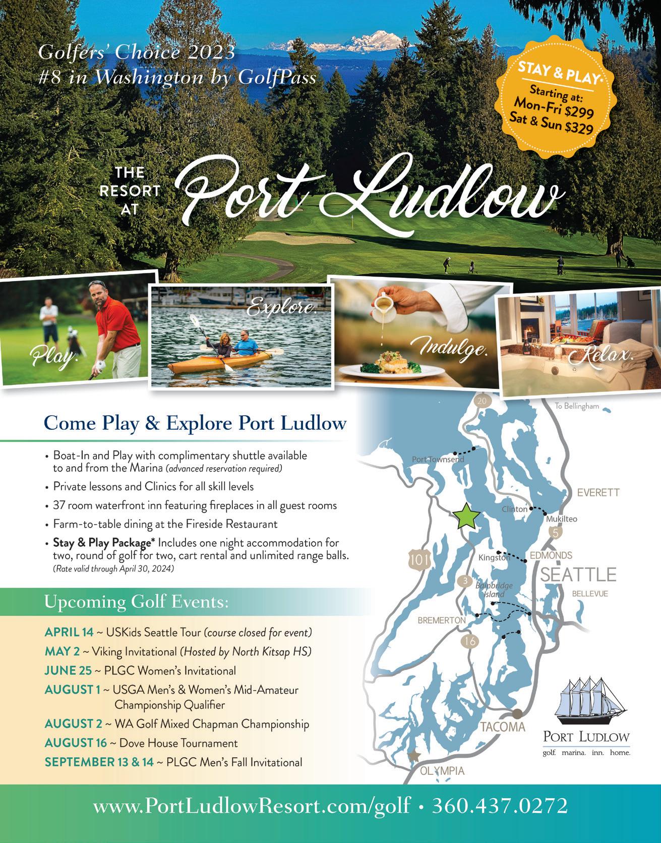 Sherwin, Bart Potter, Steve Hamilton & Charles Beene FOR EDITORIAL SUBMISSIONS AND INQUIRIES: Dick Stephens • Publisher stephens@varsitycommunications.com FOR ACCOUNTING INQUIRIES: Kirk Tourtillotte • Publisher kirk@varsitycommunications.com ADVERTISING & MARKETING STAFF SALES/MARKETING MANAGER & TOURNAMENT DIRECTOR Simon Dubiel simon@cascadegolfer.com All photos are courtesy of the course or individual unless otherwise noted. COPYRIGHT 2024 Cascade Golfer. PRINTED IN THE USA. All rights reserved. Articles, photos, advertising and/ or graphics may not be reprinted without the written permission of the publisher. Advertising and editorial contained herein does not constitute endorsement of Cascade Golfer or Varsity Communications, Inc. Publisher reserves the right to edit letters, photos and copy submitted and publish only excerpts. The publisher has made every effort to ensure the accuracy of all material contained in this issue. However, as unpredictable changes and errors do occur, the publisher can assume no liability for errors, omissions or changes. PRODUCER AND OWNER OF THE Cascade Golfer is published and owned by Varsity Communications, Inc. It’s mailed via USPS to 50,000 homes and e-mailed to 100,000 golfers in Puget Sound. VARSITY COMMUNICATIONS, INC. varsitycommunications.com