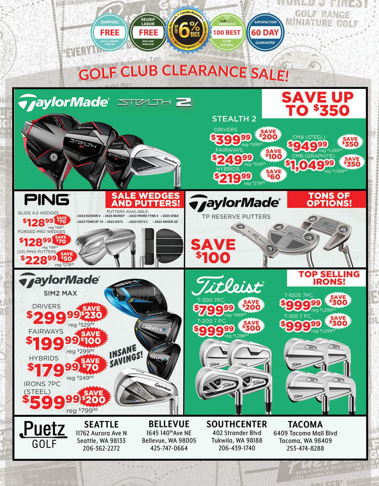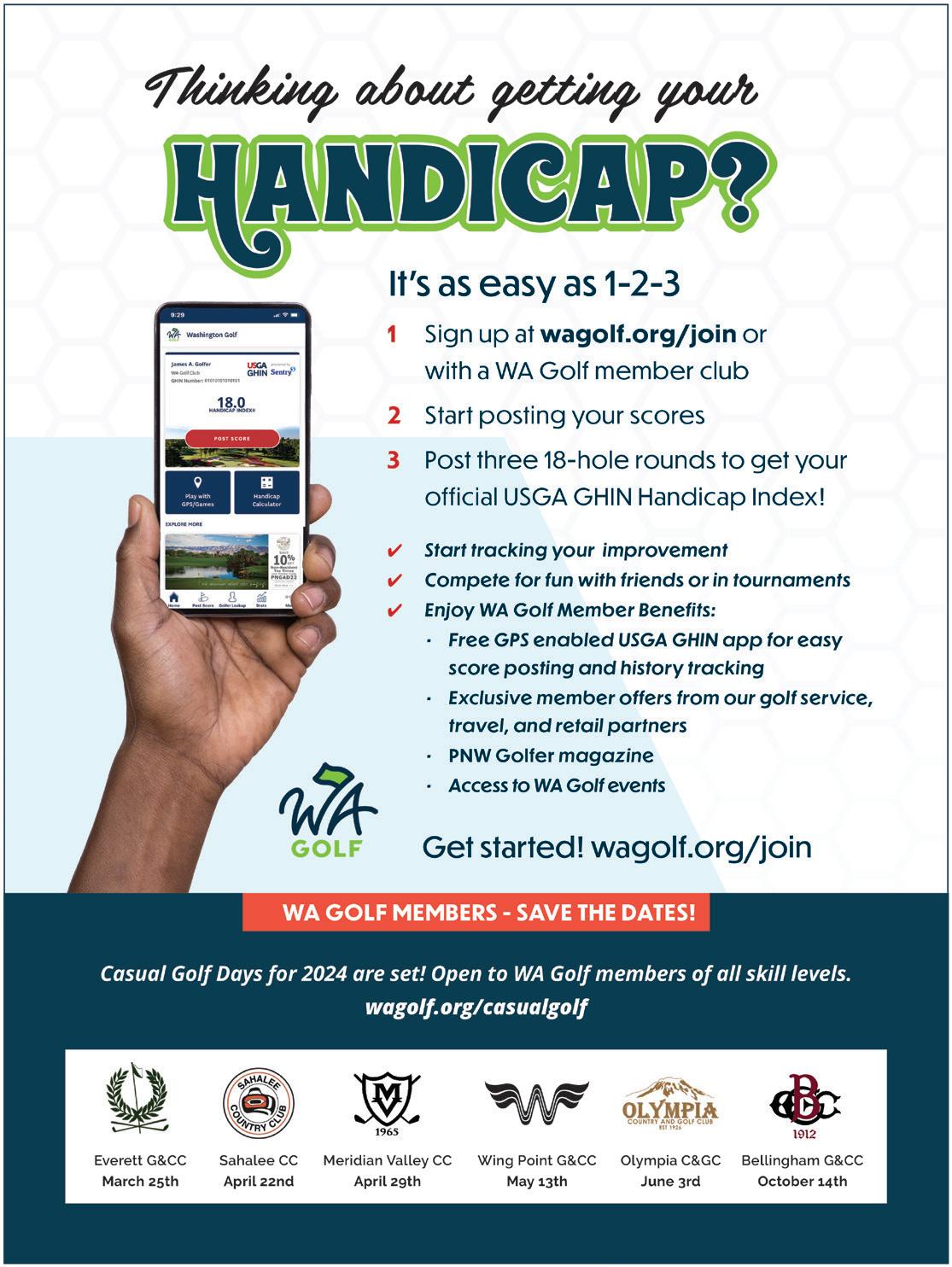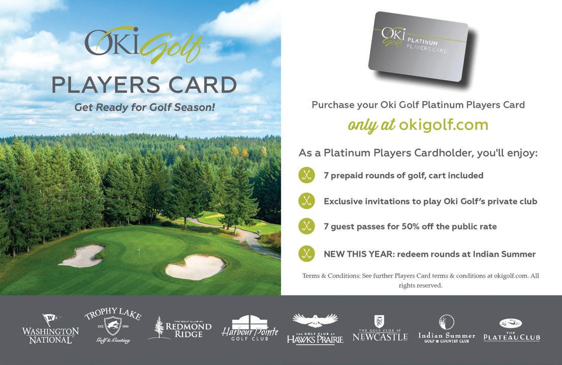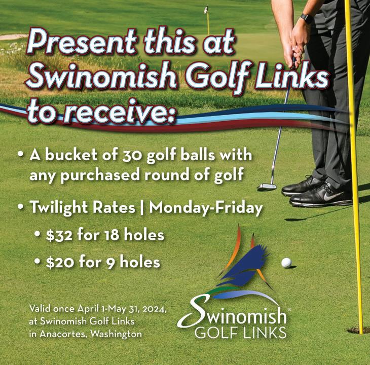 Sherwin, Bart Potter, Steve Hamilton & Charles Beene FOR EDITORIAL SUBMISSIONS AND INQUIRIES: Dick Stephens • Publisher stephens@varsitycommunications.com FOR ACCOUNTING INQUIRIES: Kirk Tourtillotte • Publisher kirk@varsitycommunications.com ADVERTISING & MARKETING STAFF SALES/MARKETING MANAGER & TOURNAMENT DIRECTOR Simon Dubiel simon@cascadegolfer.com All photos are courtesy of the course or individual unless otherwise noted. COPYRIGHT 2024 Cascade Golfer. PRINTED IN THE USA. All rights reserved. Articles, photos, advertising and/ or graphics may not be reprinted without the written permission of the publisher. Advertising and editorial contained herein does not constitute endorsement of Cascade Golfer or Varsity Communications, Inc. Publisher reserves the right to edit letters, photos and copy submitted and publish only excerpts. The publisher has made every effort to ensure the accuracy of all material contained in this issue. However, as unpredictable changes and errors do occur, the publisher can assume no liability for errors, omissions or changes. PRODUCER AND OWNER OF THE Cascade Golfer is published and owned by Varsity Communications, Inc. It’s mailed via USPS to 50,000 homes and e-mailed to 100,000 golfers in Puget Sound. VARSITY COMMUNICATIONS, INC. varsitycommunications.com