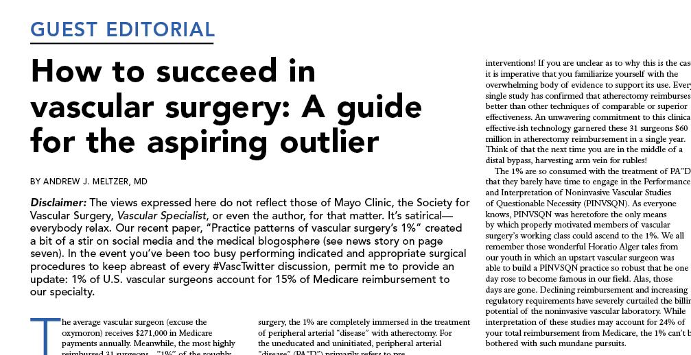The ideas and opinions expressed in Vascular Specialist do not necessarily reflect those of the Society or the Publisher. The Society for Vascular Surgery and BIBA Publishing will not assume responsibility for damages, loss, or claims of any kind arising from or related to the information contained in this publication, including any claims related to the products, drugs, or services, or the quality or endorsement of advertised products or services, mentioned herein.