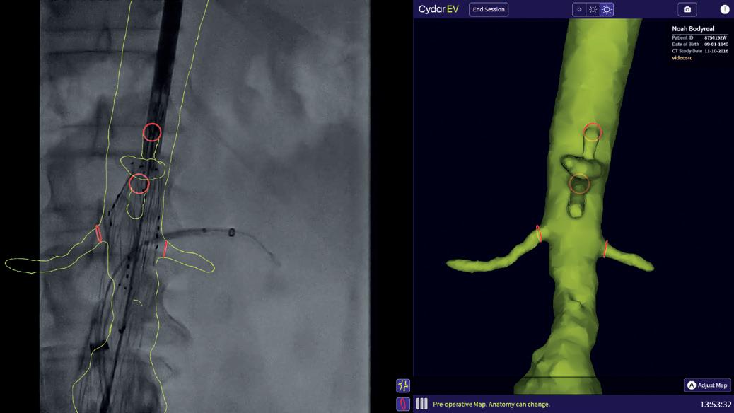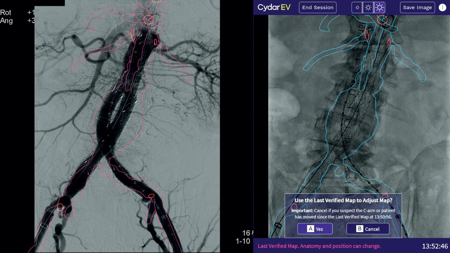 complex endovascular aneurysm repairs, including infrarenal, fenestrated, custom-made, and thoracoabdominal branched graft devices (Figure 3, A–D). The results of our experience are being prepared for abstract submission for the 2021 Society for Vascular Surgery Vascular Annual Meeting, including a comparative analysis of nearly 200 consecutive fenestrated endograft aneurysm repairs, with 68 using Cydar EV imaging. Our outcomes are similar to other institutional reports with Cydar EV, noting decreases in operative and fluoroscopy times, radiation dosage, total contrast volume, and number of digital subtraction angiography runs required.2 The workflow is simple. A preoperative computed tomography angiography (CTA) is uploaded to the cloud-based Cydar Vault, from which a 3D model and overlay is created (Figure 1). From imaging upload to readiness for image-guided surgery, the process can be completed in as little as 30 minutes. The ability to visualise preprocedure a 3D-overlay with skeletal reference points has improved our confidence in device orientation and procedural planning for endovascular aneurysm repair. Enabling fluoroscopy brings the Intelligent Map on-screen, with options to view markers for branch vessel origin, true lumen outline, or both (Figure 2A; images formatted for illustration). If wire or device positioning creates vessel deformation, the AI machine learning corrects for morphology, with the system also allowing operator-driven adjustments to the overlay map (Figure 2A, 2B). Adjusted Maps are marked with a colour change to the overlay, with the ability to reference or return to the preoperative map at all times. If collimation or magnification prohibits adequate view of reference vertebral bodies, a last verified map feature allows for continued overlay (Figure 2C). With Cydar EV, the spectrum of our aortic endovascular procedures (Figure 3) is being performed more efficiently, with increased confidence, and as a safer intervention for both patient and practitioner.