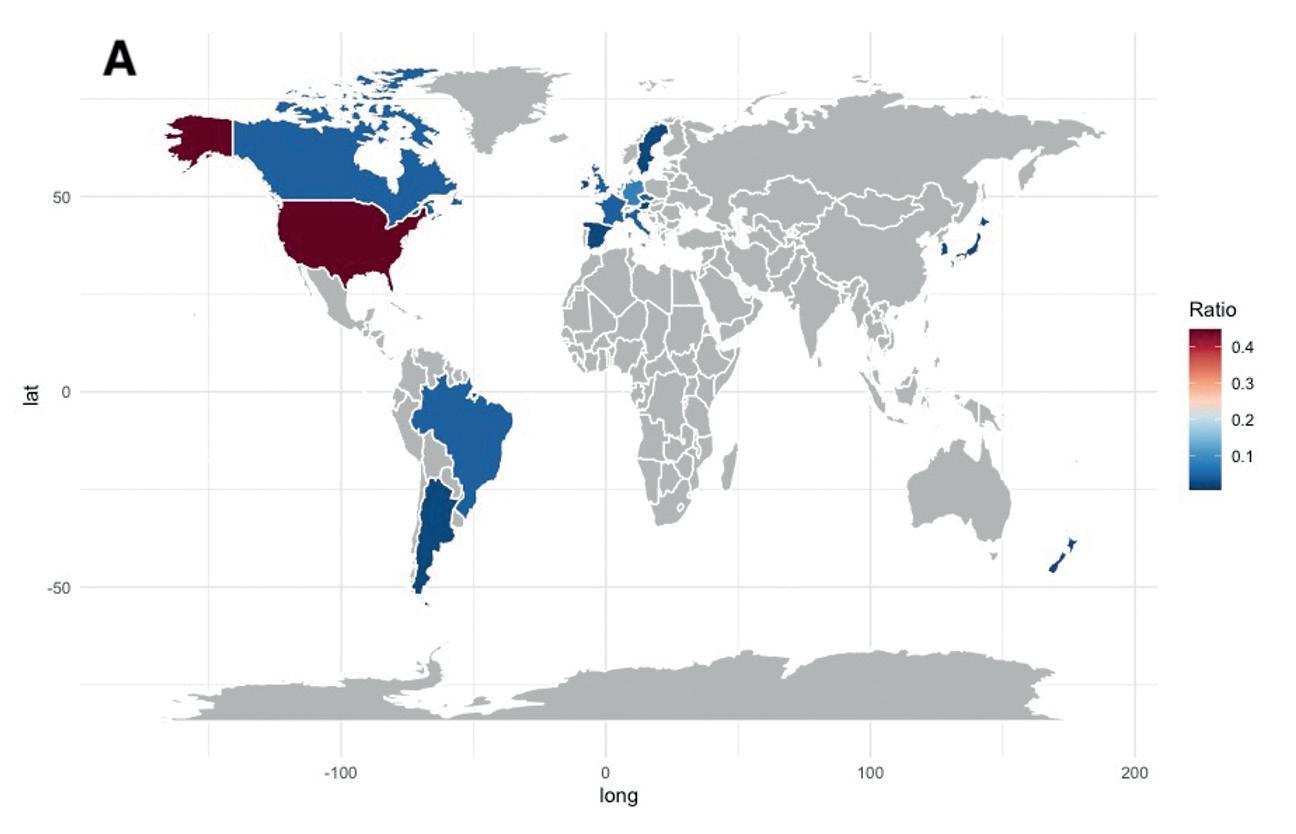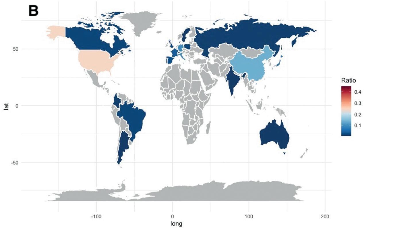 Geographical distribution of publication ratios, pre- (A) and post-2015 (B) comparison