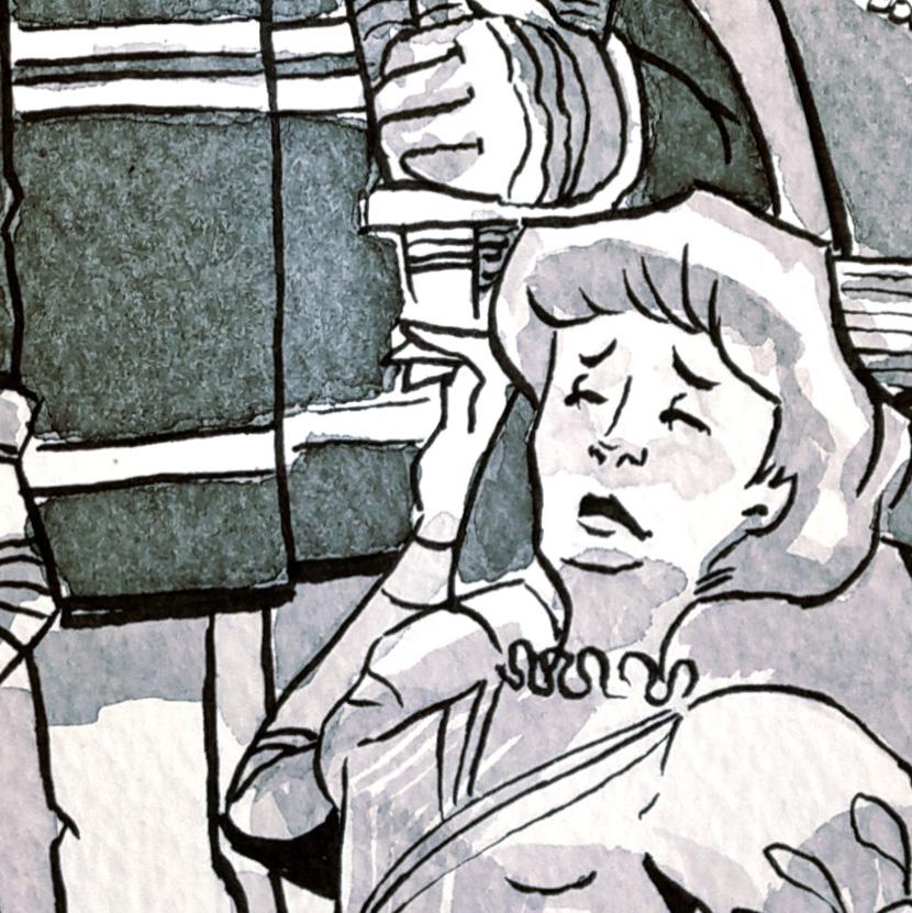 One of Spowers’ such revered images is Wet Afternoon. Anonymous figures shelter under a huddle of patterned umbrellas, the curves and repetition conveying a dynamism that captures the motion of wind and rain and the pace of everyday life. Syme’s choreographed snow scene in Skating shows figures in the foreground twisting and turning in full concentration while those in the background lean and teeter, with connected, intersecting lines drawn to accentuate the skaters’