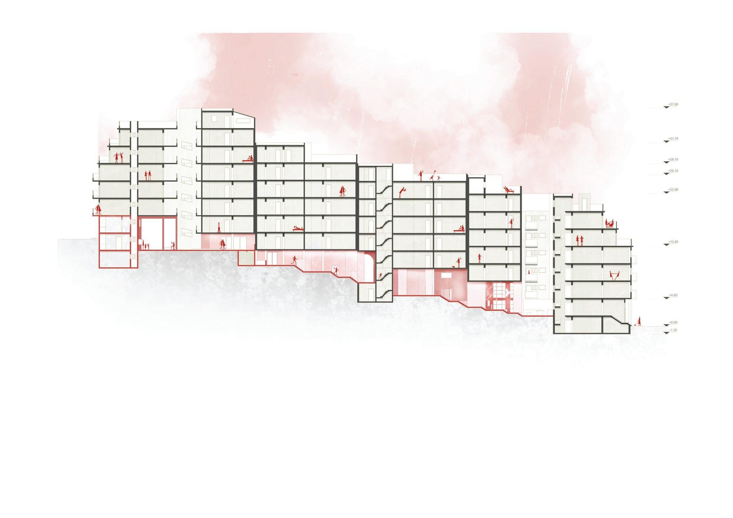 έχει επεκταθεί μέσα από τις στοές και τα καταστήματα, που συνήθως βρίσκονται στα ισόγεια, και τα υπόλοιπα δημόσια προγράμματα διασκορπισμένα στους επάνω ορόφους της πολυκατοικίας. Ταυτόχρονα, πολλές οικιακές 5