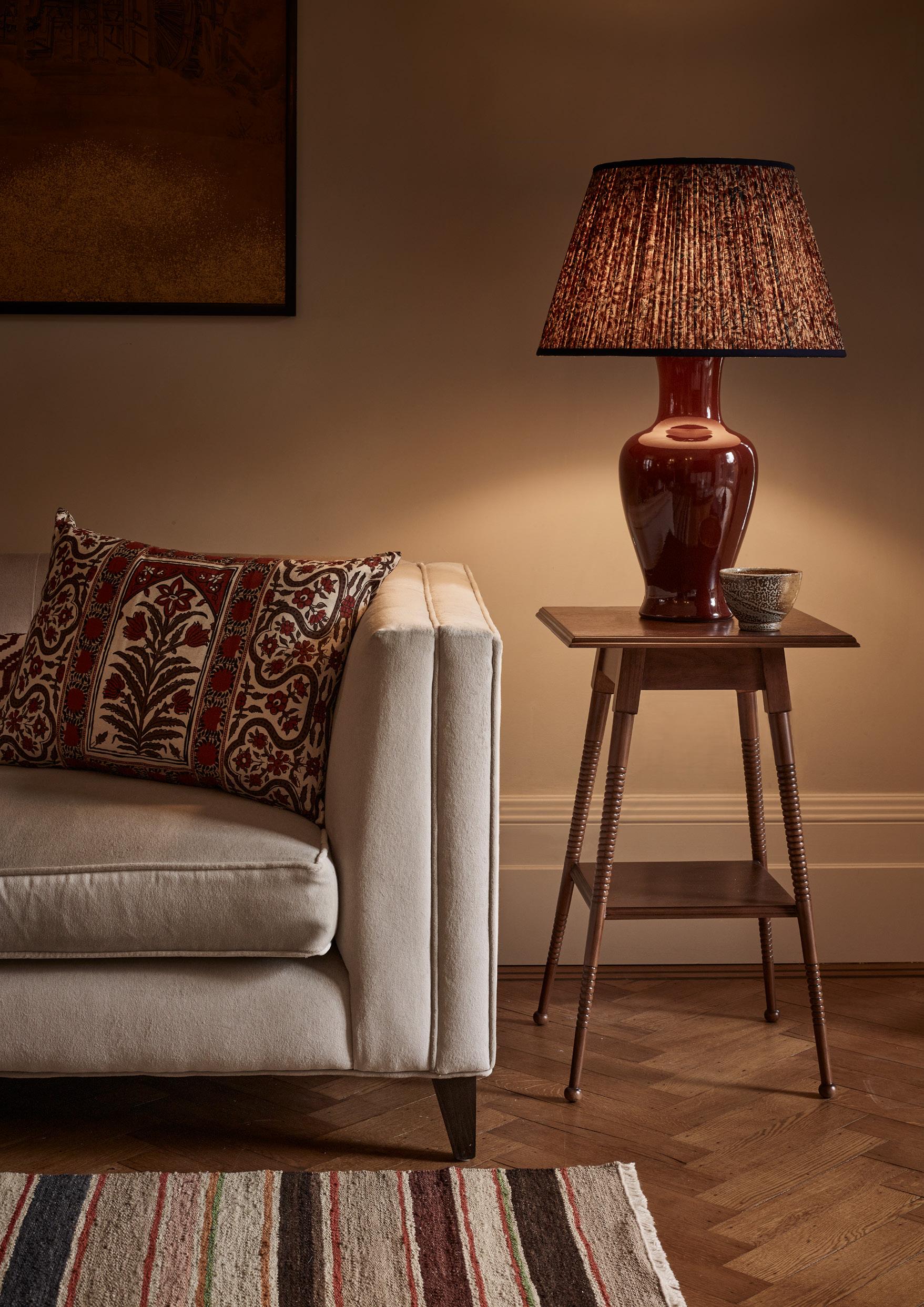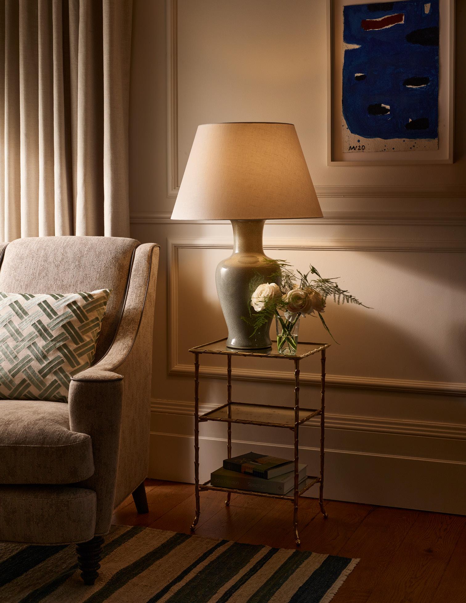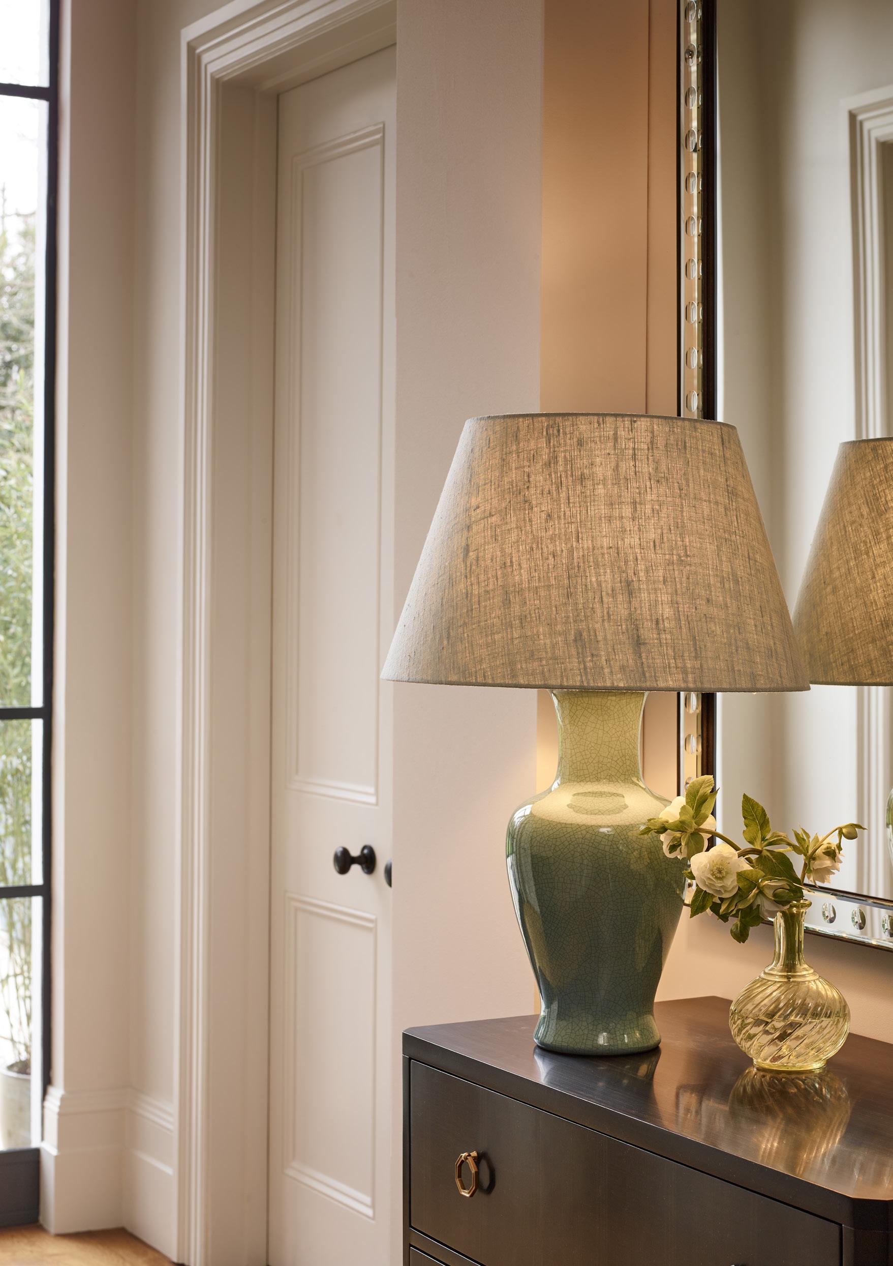Already part of the Vaughan collection, the Fishtail Vase table lamps are produced in a crackle glazed earthenware and have an elegant, curved shape. Newly designed in Stone, Duck Egg, and Sang de Boeuf glazes and available with a black, brass or gilt base or without a base.