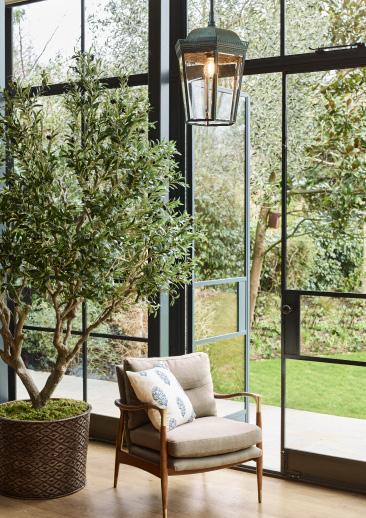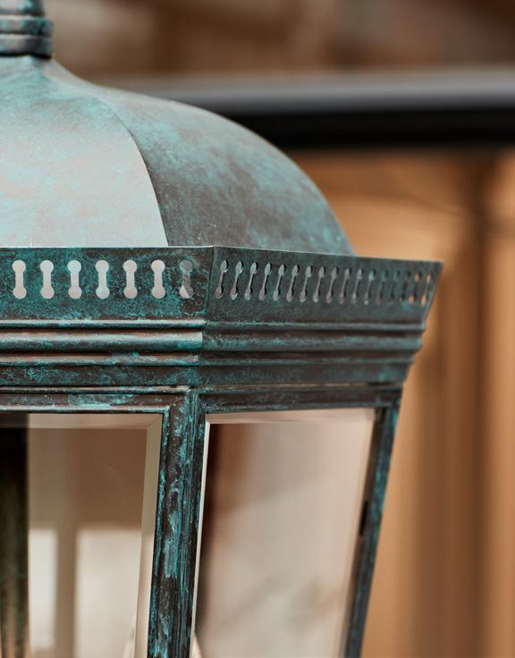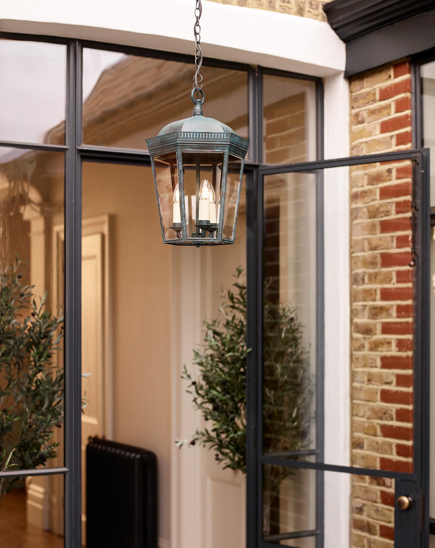 Newly designed in a verdigris finish, the Bentworth Lantern is hand-fabricated from copper and given a verdigris finish. Supplied with chain, a fixed rod kit can be ordered and fitted separately. Also available in a black, bronze or brass finish and a smaller 1 light version. Suitable for outdoor use.