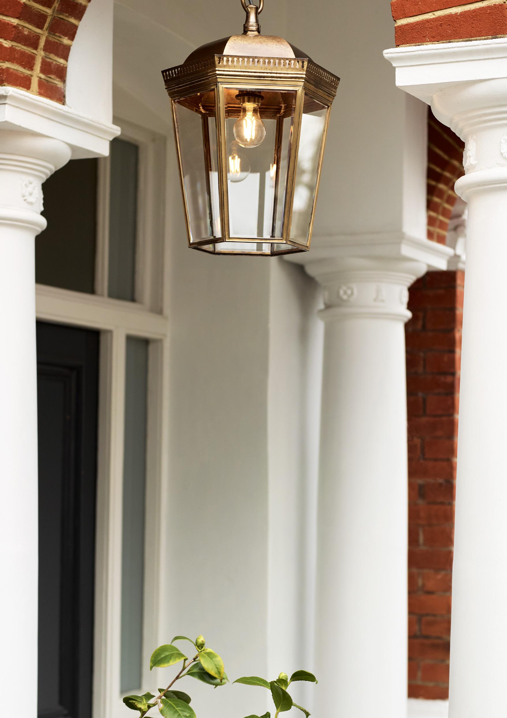Designed in brass, the pared back design of this lantern features a graceful, curved hood and pierced metalwork. The Bentworth Lantern is hand-fabricated in brass and fitted with beveled glass panels. Supplied with chain, a fixed rod kit can be ordered and fitted separately. Also available in a black, bronze or verdigris finish. Suitable for outdoor use.
