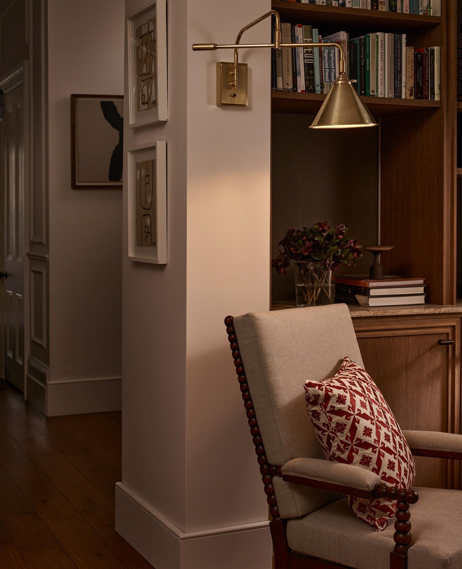 Newly designed with a spun metal brass shade, the Chetham Library Wall Light is inspired by an original 1950’s French design. Modernist in style, the cast brass backplate with on/off switch is complemented by the jointed swivel arm and spun metal shade. Perfect for library, task, or as a reading light.
