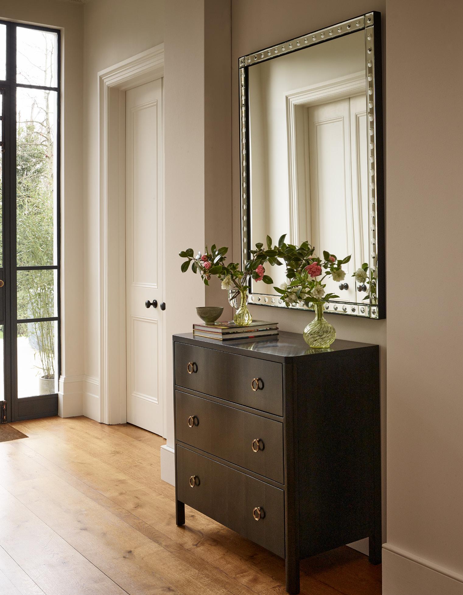 Now available in an extra-large size, the Battersea Mirror is inspired by a 19th century Venetian mirror design. The verre eglomise engraving around the frame, popular in 1940’s France, dates back to pre-Roman times. The mirror also comes in small, medium, and large sizes.