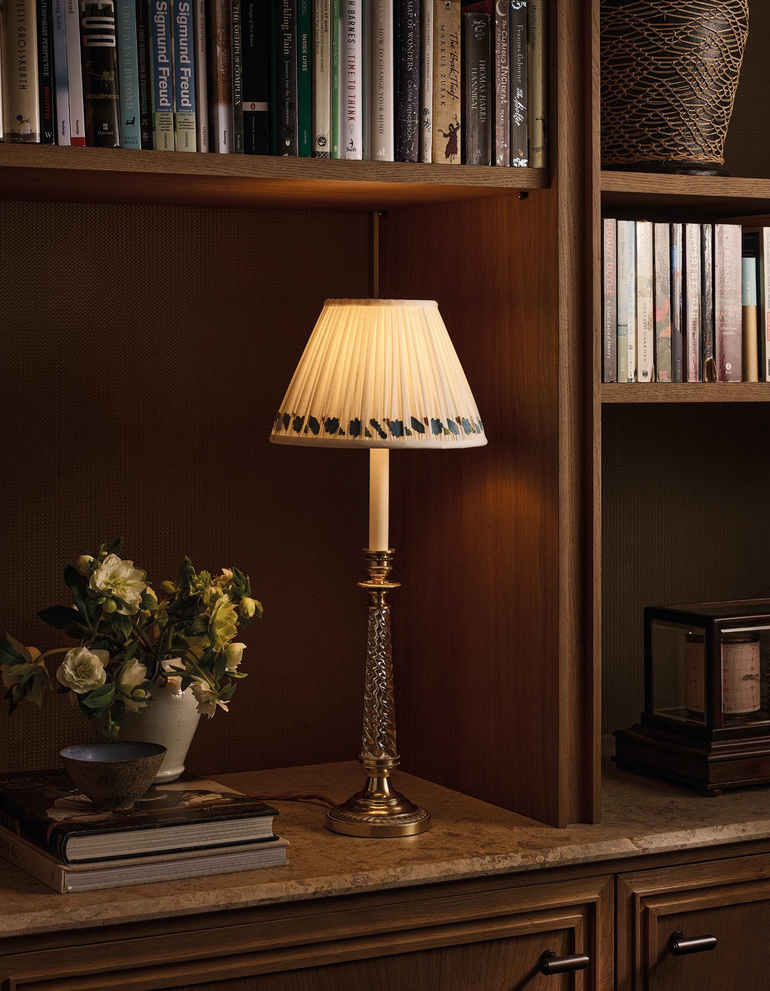 This lampshade is handmade in England, using an embroidered floral motif. The stitching is in blue embroidery thread and it is available in a range of sizes alongside another design ‘Sophie.’ Also available in a pink thread and pictured here with our Twisted Glass Candlestick.