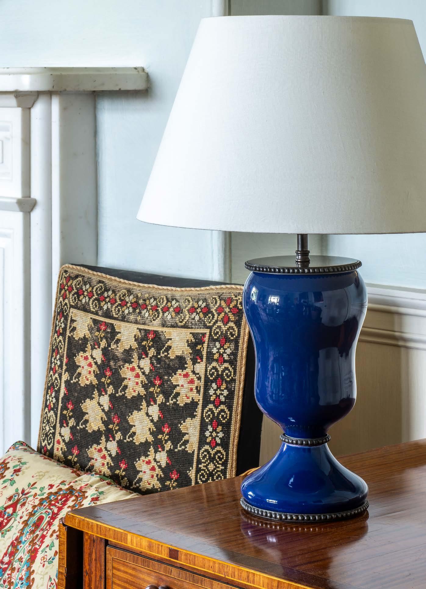 Based on an antique Victorian lamp, the bronzed design beaded detailing adds character to the beautifully rounded ceramic vase in midnight blue. The crackle glaze adds texture and complexity to the piece.