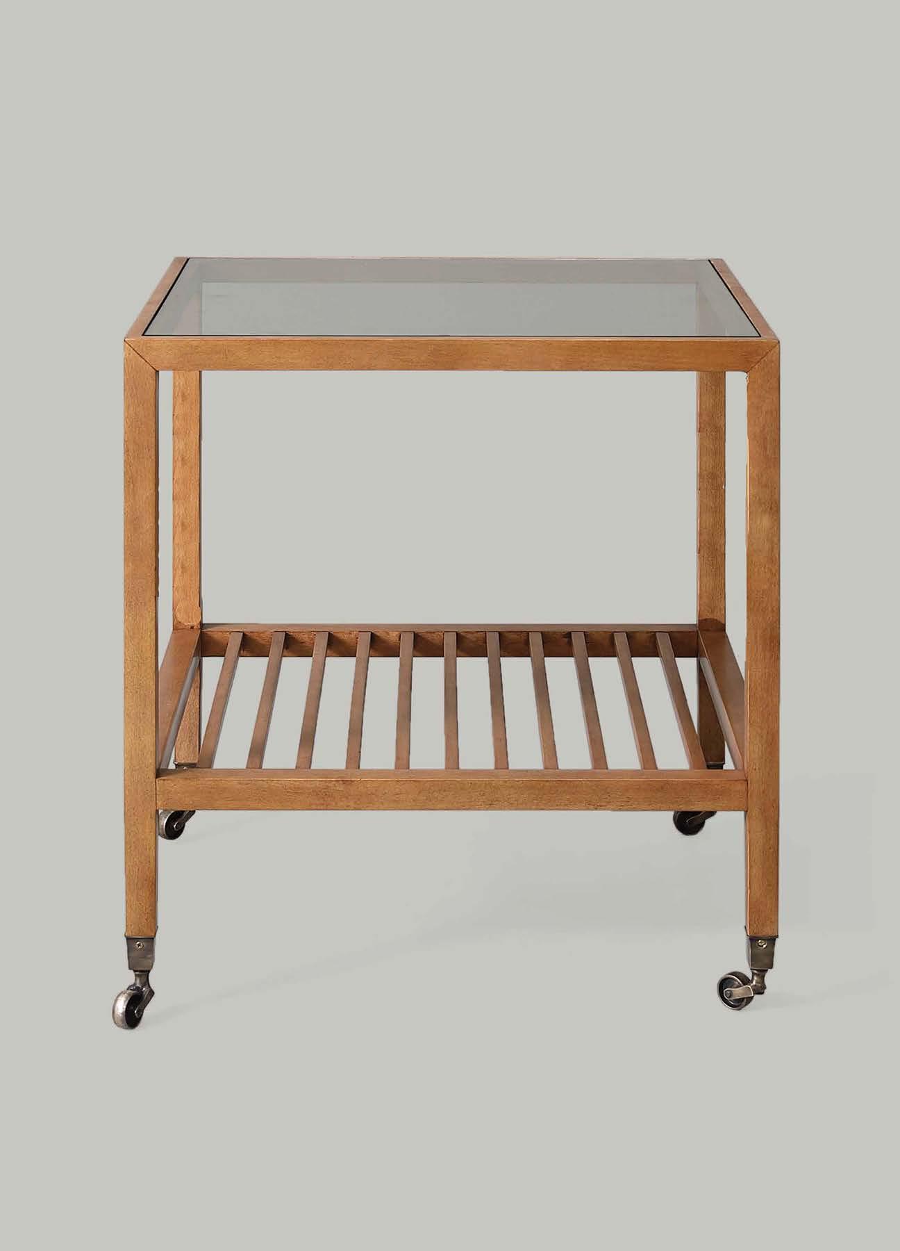 Loosely based on an antique original, this side table has a contemporary feel to it thanks to the combination of glass and wooden slats. A pared down design, it is finished with antique brass casters.