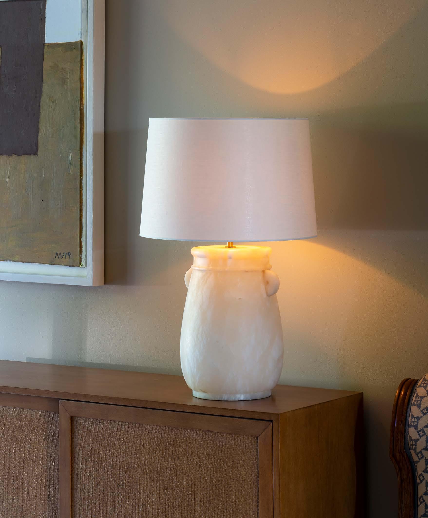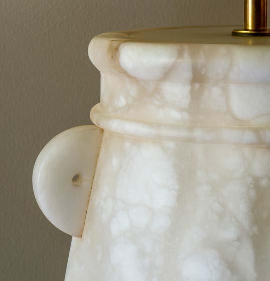 A charming design, this table lamp is centred around a traditional urn shape, complete with distinctive, characterful handles. Made out of alabaster, it has a sturdy solidness and a wonderfully nuanced colour.