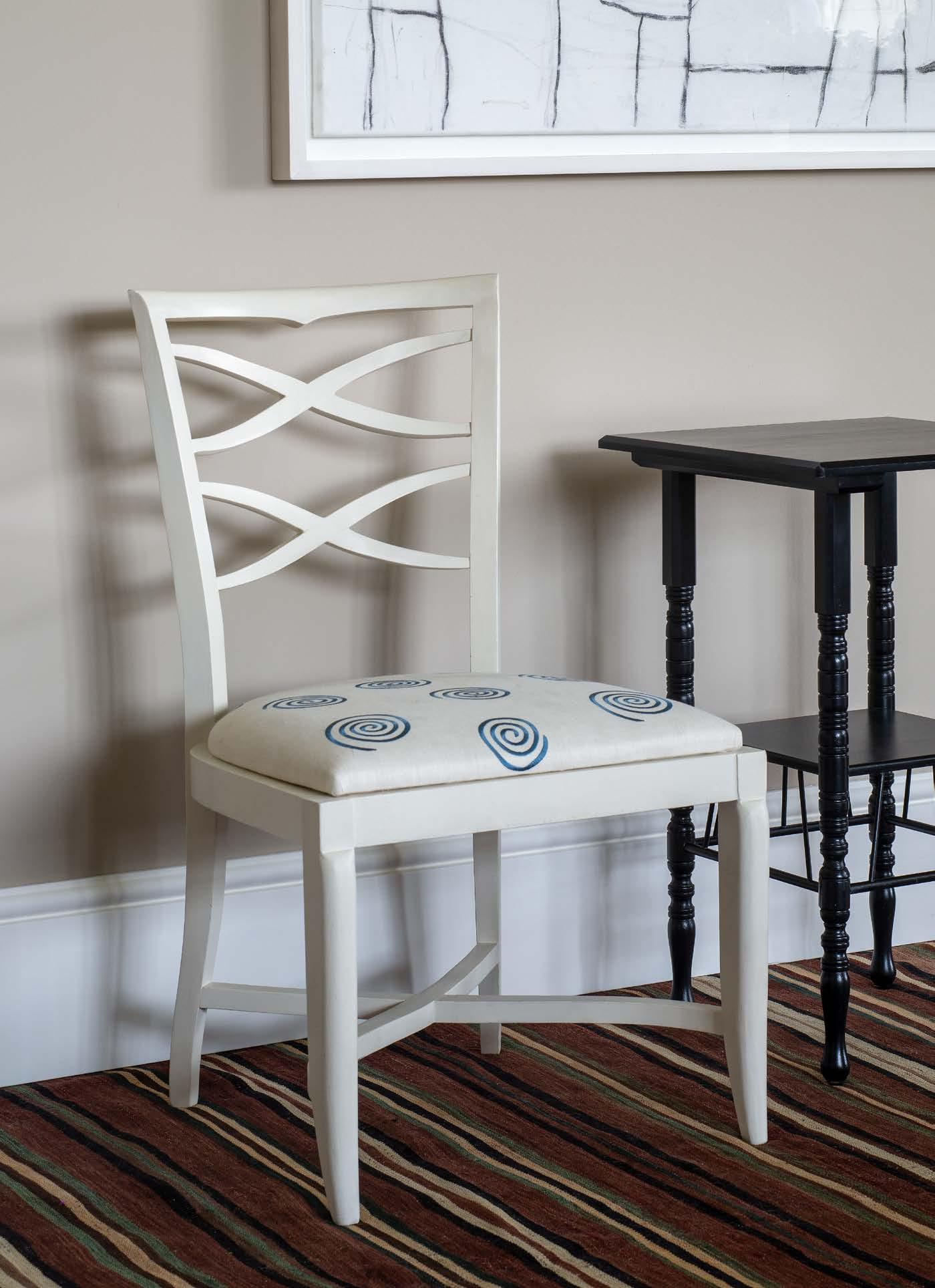 An elegant design, this dining chair has a wonderful flow to it thanks to the lattice motif. Finished in a painted chalk white finish, it has a compelling contemporary feel.