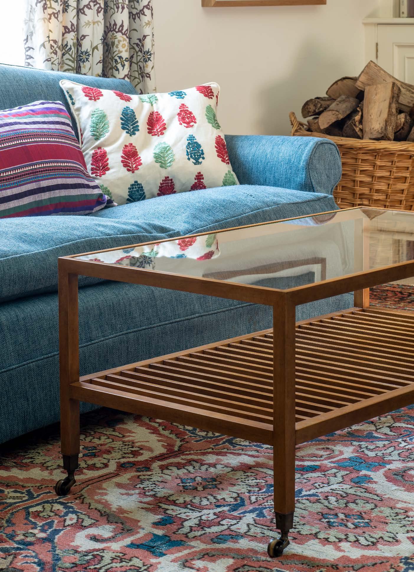 Loosely based on an antique, this large, rectangular coffee table has a contemporary feel to it thanks to the combination of clear glass and wooden slats. A pared down design, it is finished with antiqued brass casters.