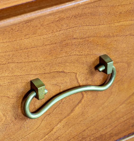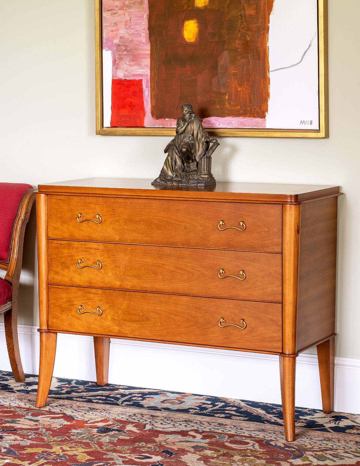 Inspired by French design of the 1940s, this chest of drawers is an elegant piece thanks to the tapered legs and curved brass handles. Based on an original antique, it has a distinctly timeless feel to it. Finished in cherrywood.