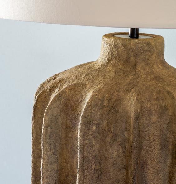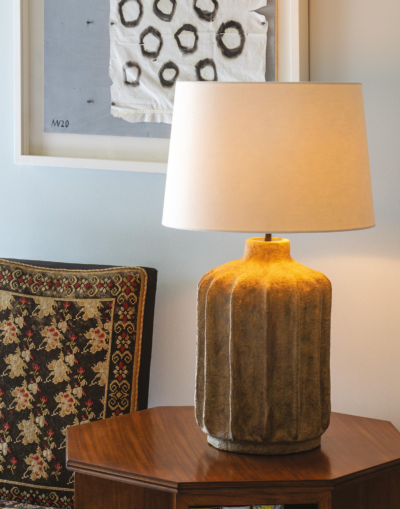 Large in scale, this table lamp has a sophistication and monumentality to it. Initially modelled in clay by our design team, this ceramic piece is then given a striking antiqued finish glaze.