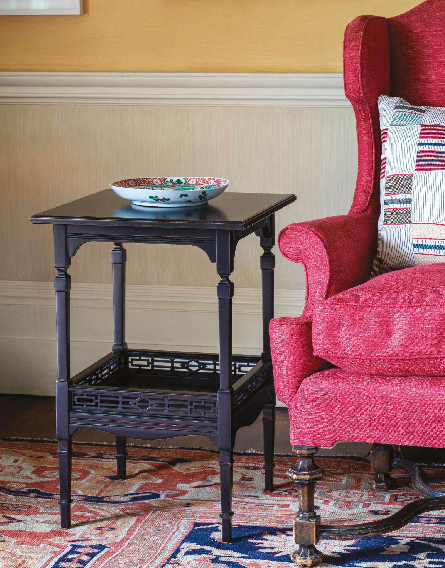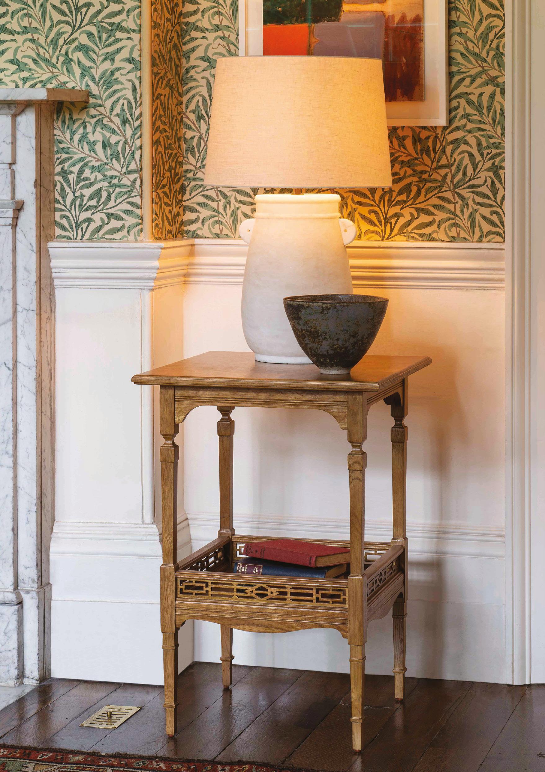 Based on an antique original Lucy and Michael bought at auction, this table harks back to the Aesthetic Movement. Available in both an ebonised wood and a light oak finish, it is finely decorated with fretwork detailing.