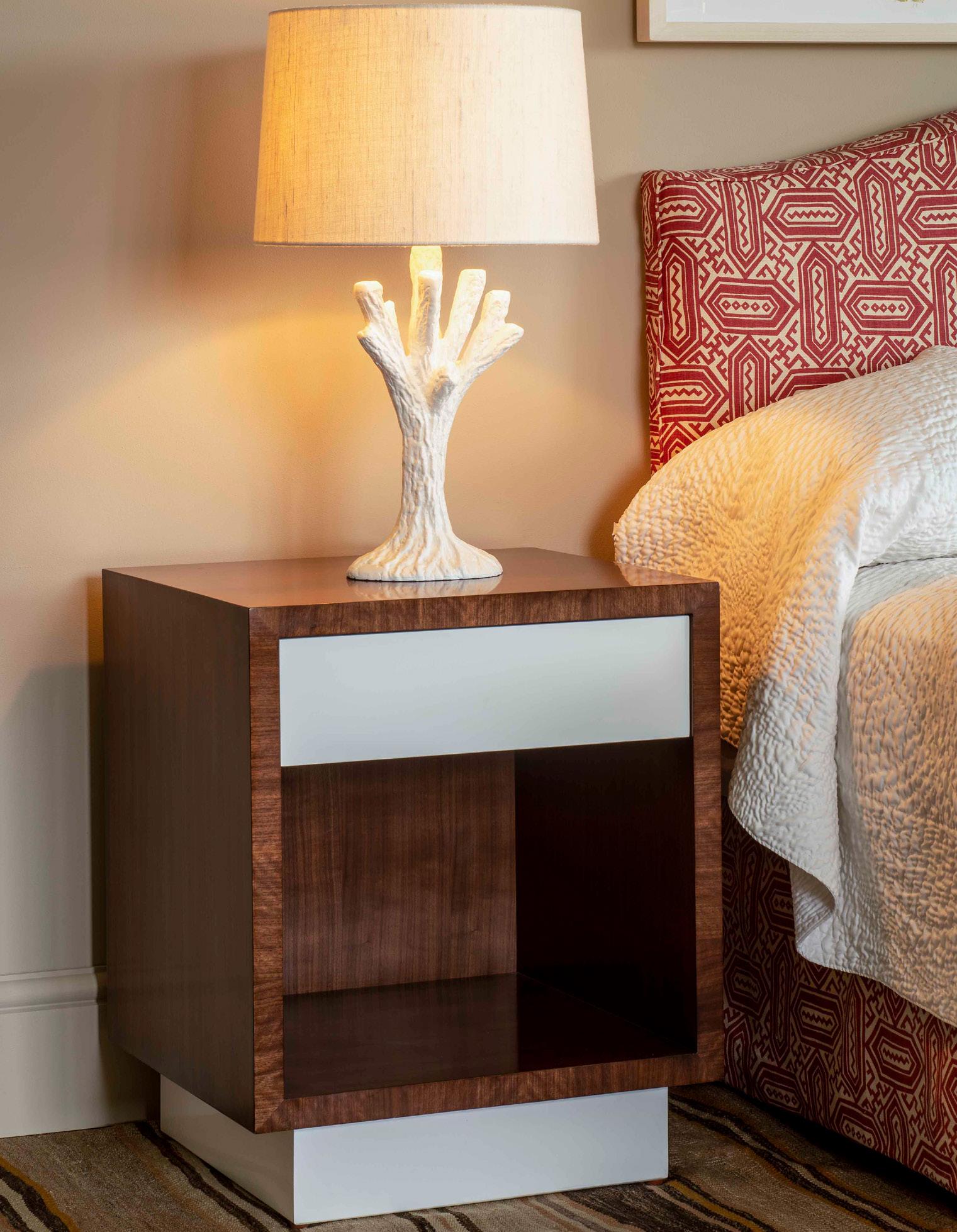 A streamlined design, this piece stands out with its contrasting drawer and base. Pared down and minimalist in style, it takes its inspiration from Japanese antiques. Finished in walnut wood with a white lacquered base and drawer.