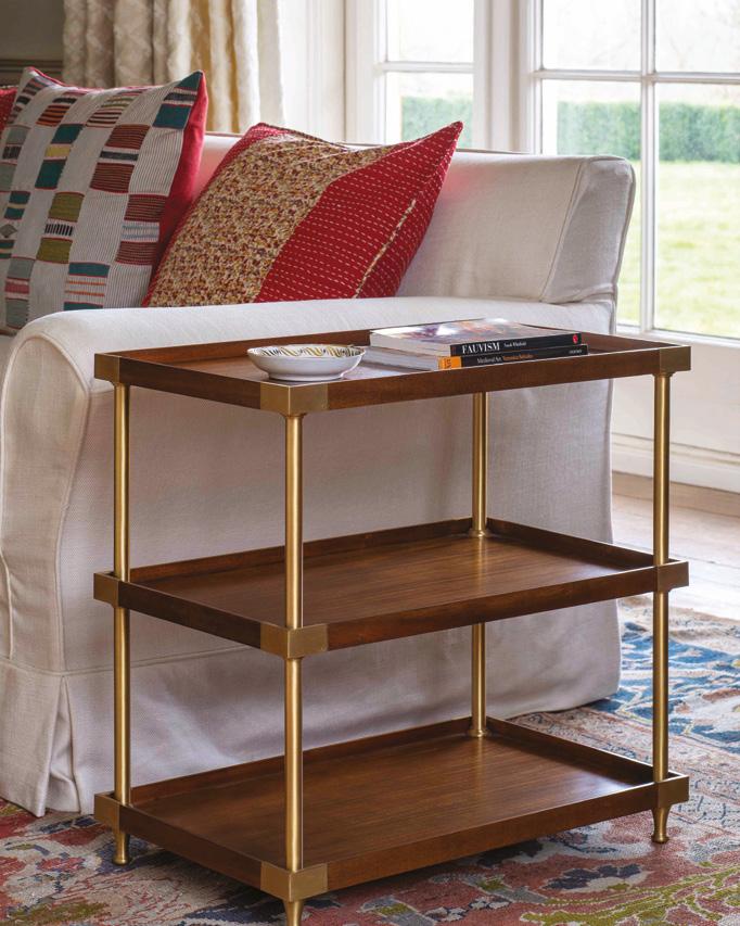 Formed of three tiers, these etageres take their inspiration from 1950s design. A satisfying combination of wood and brass gives a sophisticated, modern feel. Finished in acacia wood with solid brass legs.
