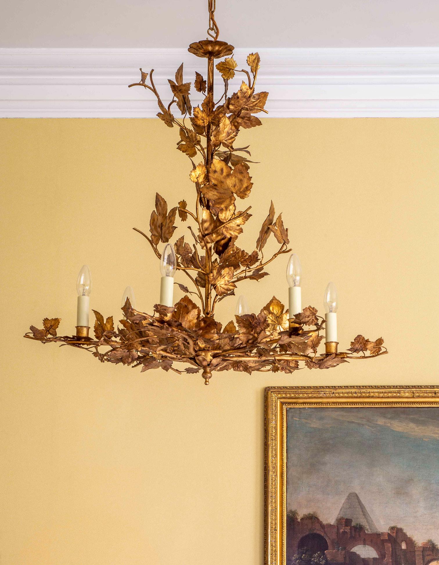 Based on an original antique, this chandelier focuses on a foliate design and has been decorated with individually pressed and formed maple leaves in a gilt finish.