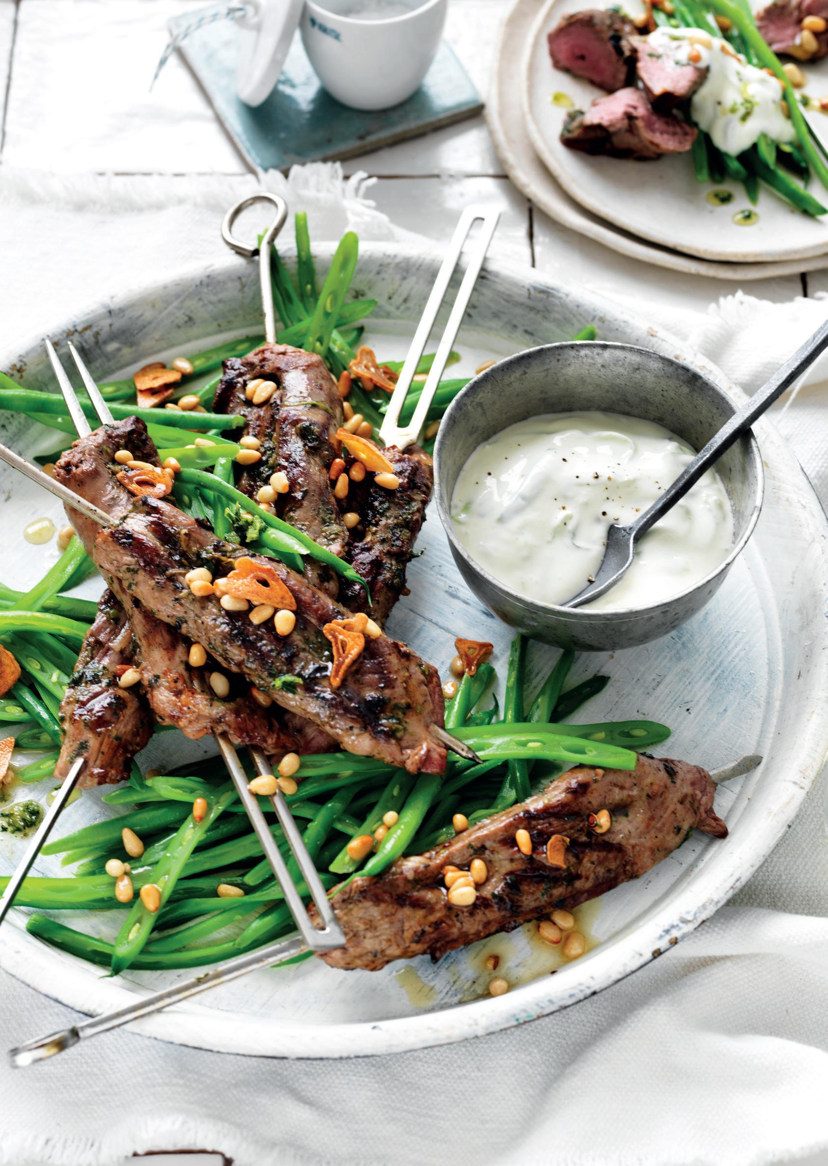 6 Serveer het lamsvlees met de knoflookbonen en tzatzikidressing.
