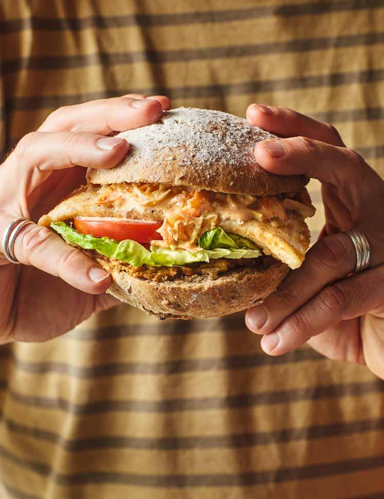 Je weet wellicht al hoe dol ik ben op een broodje warme vis. Deze nieuwste versie combineert vis met een overheerlijke saté-pindakaas en ik voeg daar graag nog een contrasterend laagje knapperige kimchi-slaw aan toe. Dit broodje is erg lekker met filets van witte vis, bijv. schelvis of koolvis, maar is ook niet te versmaden met een steviger vis, zoals makreel of brasem.