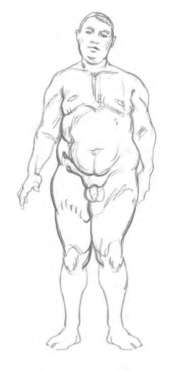 Op deze tekening komen de gearceerde gebieden overeen met de plaatsen waar zich vetweefsel bevindt. Van de ledematen wordt aangenomen dat de dikte van het vetweefsel afneemt vanaf de wortel naar de uiteinden toe. De vetophoping aan de achterkant van de triceps (onder het deltagebied) lijkt op die van de heupen (onder het trochanteregebied).