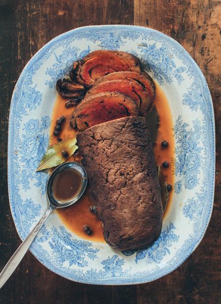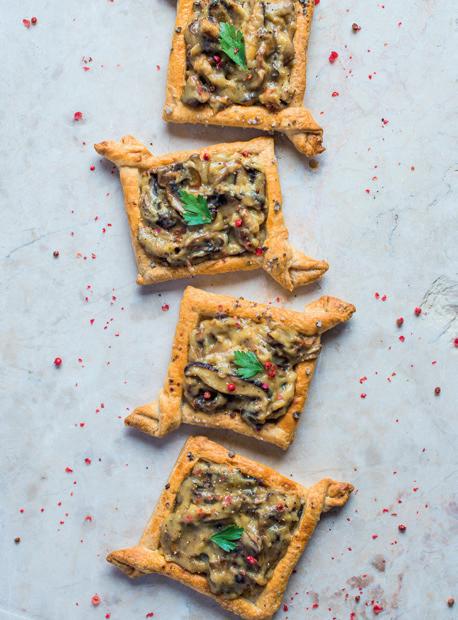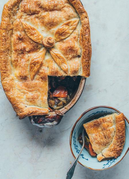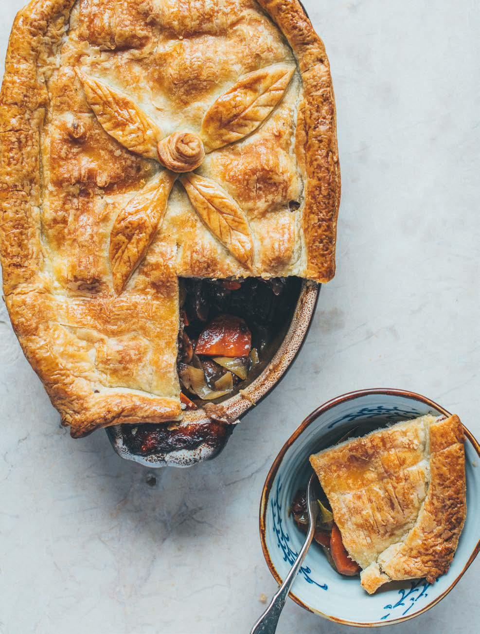 Bij het eten van deze pie dwalen mijn gedachten altijd een beetje af naar vroegere tijden en waan ik me in een oude burcht aan een feestelijk banket. De aromatische groenten smaken verrukkelijk bij de seitan, de kruiden en wijn binden alle smaken samen. En wie houdt er nou niet van zo'n lekker bladerdeegdakje …