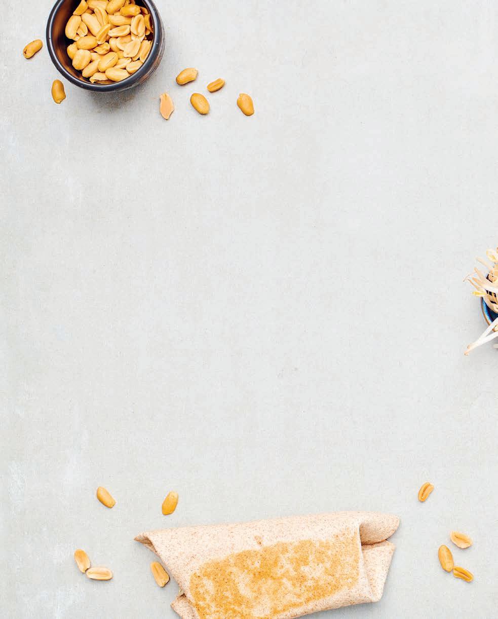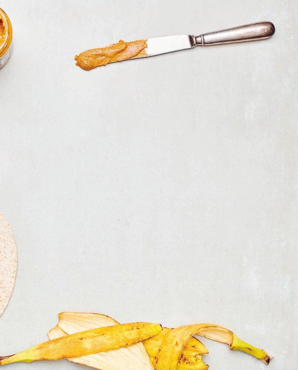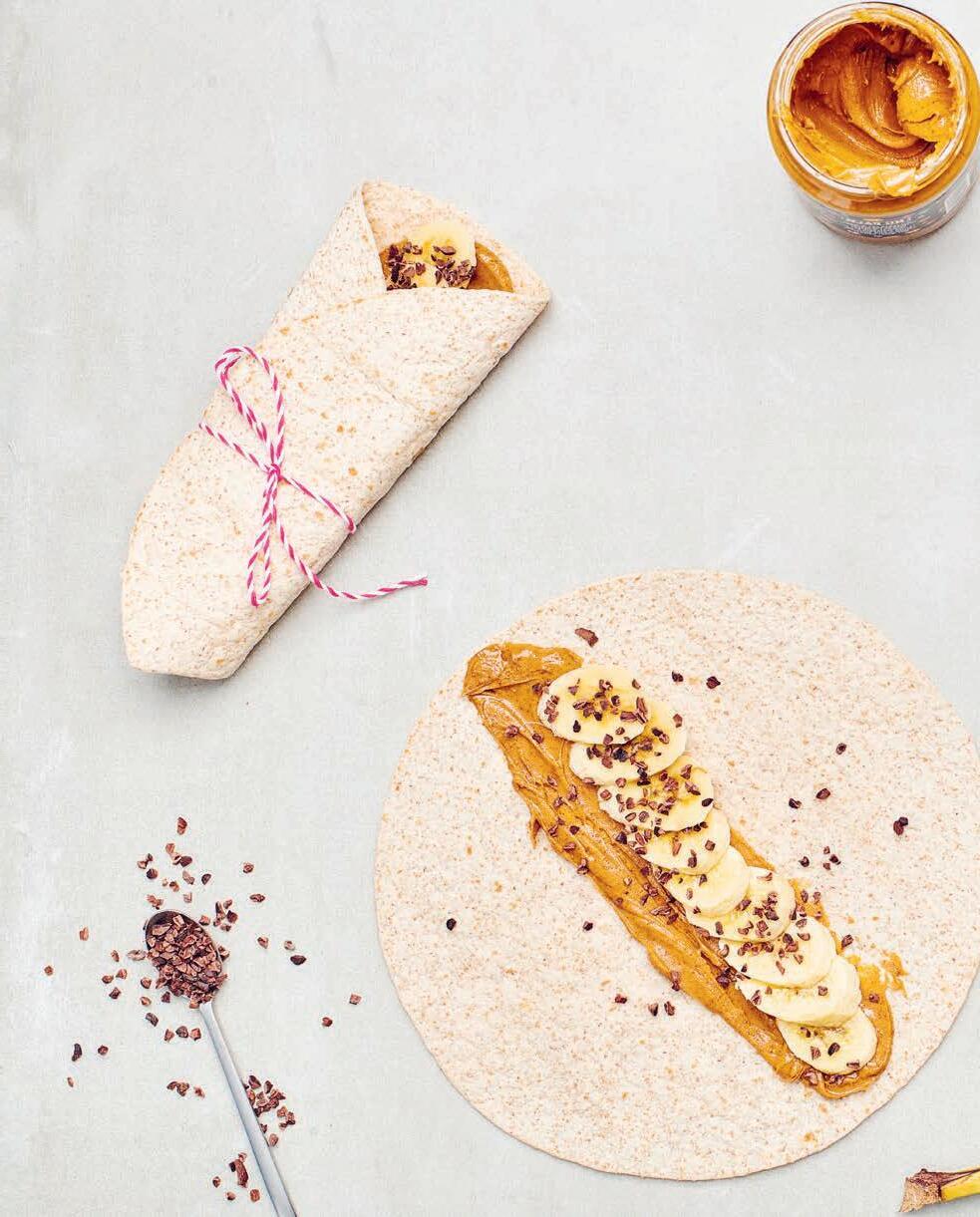 Zo maak je het: Besmeer de volkorenwraps gelijkmatig met pindakaas. Pel de bananen, snijd het vruchtvlees in plakjes en verdeel deze over de wraps. Strooi de cacaonibs eroverheen en rol de wraps op.
