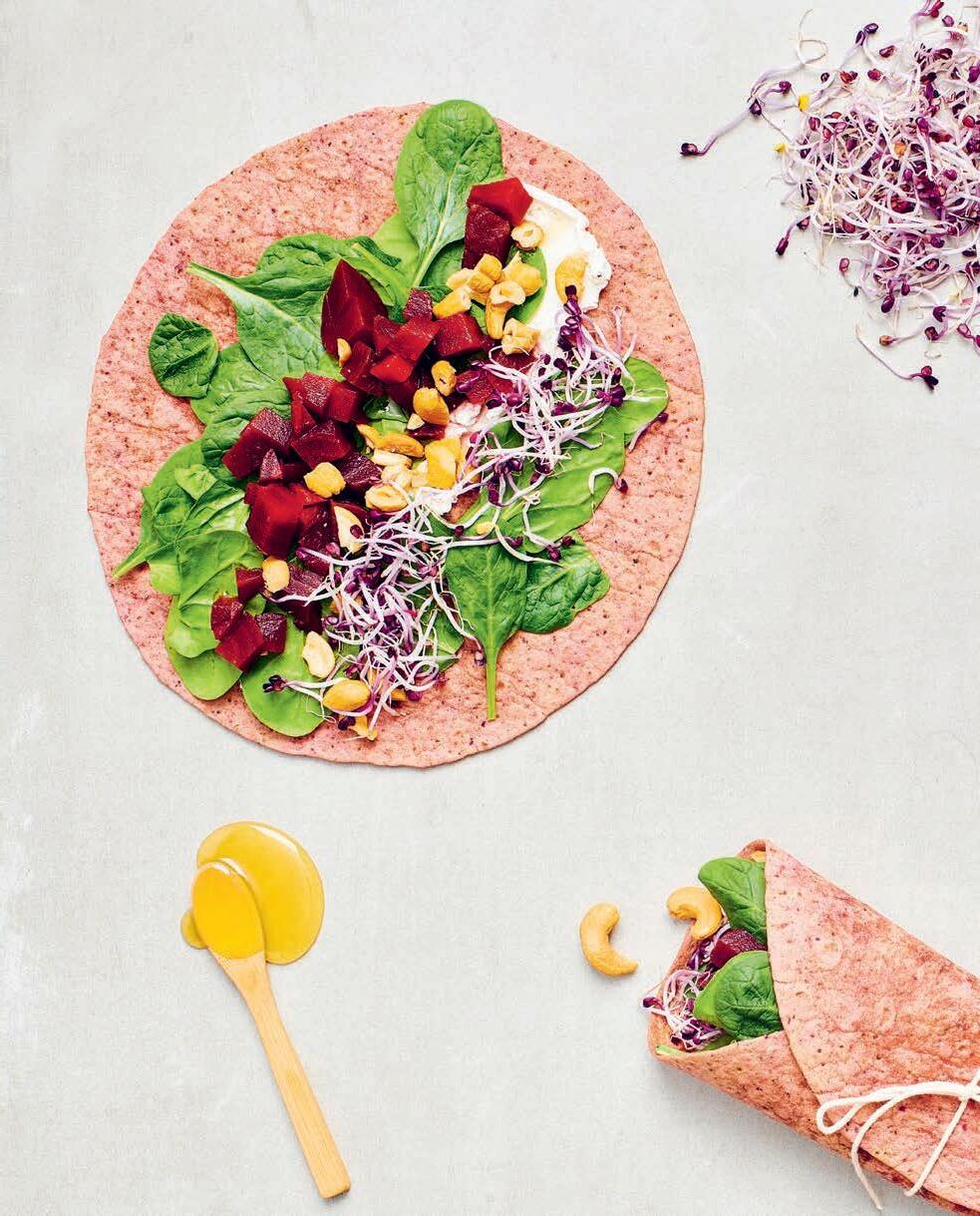 Spoel de rode bieten af en snijd ze in blokjes, hak de cashewnoten grof. Besmeer de rodebietenwraps met de geitenkaas en druppel de honing eroverheen. Voeg de spinazie, de rodebietenblokjes, de cashewnoten en de radijskiemen toe. Rol de wraps op.