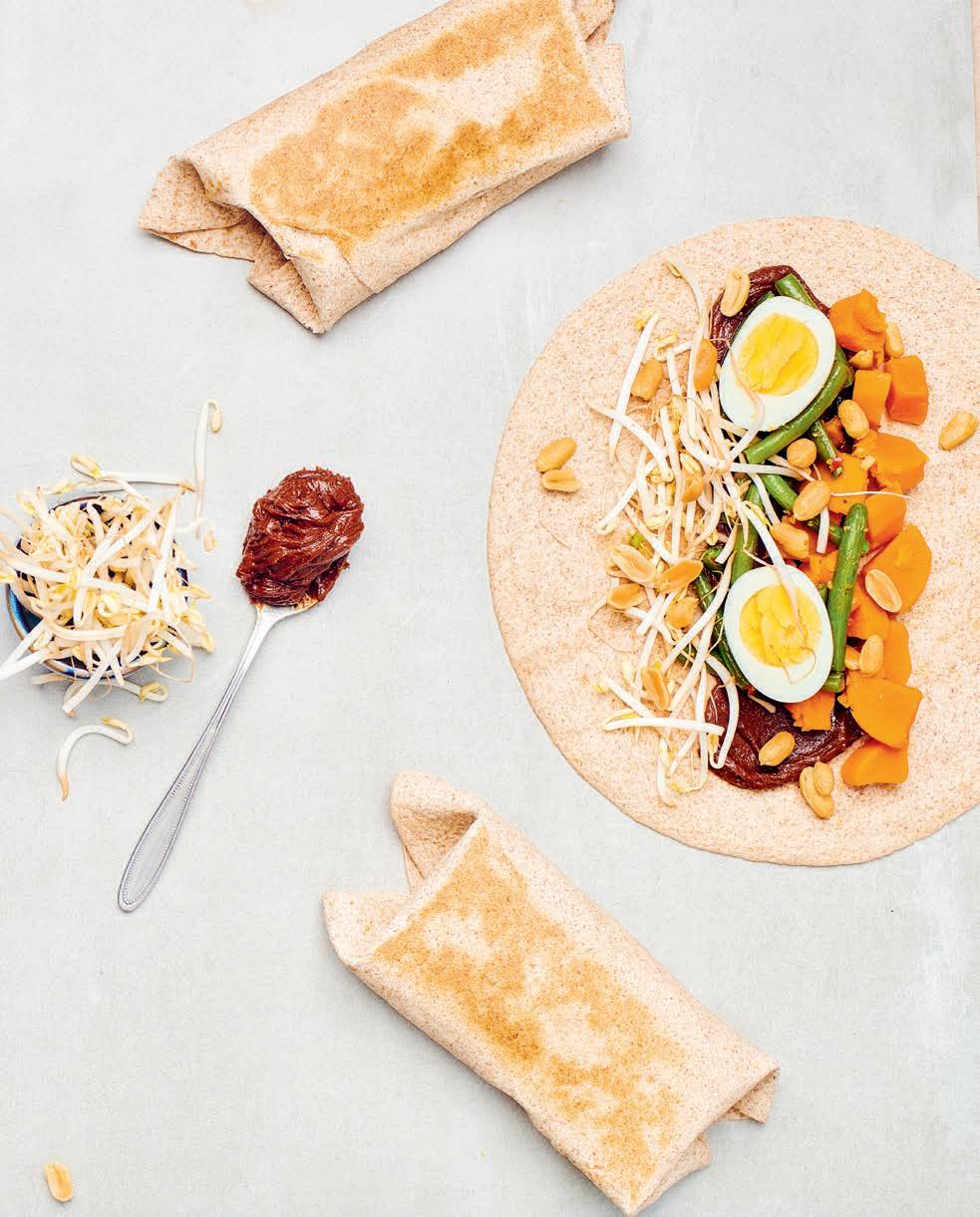Snijd intussen de rode peper (verwijder de zaadlijsten voor een minder pittige variant) en de knoflook fijn en kook de eieren in 8 minuten in kokend water hard. Laat de eieren schrikken in koud water, pel ze en snijd ze in plakjes. Meng de ingrediënten voor de pindasaus in een schaaltje. Bak de sperziebonen nog even aan met de rode peper en de knoflook, in een beetje kokosolie. Smeer de volkorenwraps in met de pindasaus, beleg ze met de sperziebonen en de zoete aardappel. Voeg de taugé, de eieren, de pinda’s en de pindasaus toe. Vouw de wraps dicht en bak ze lichtbruin in de pan (zonder olie).