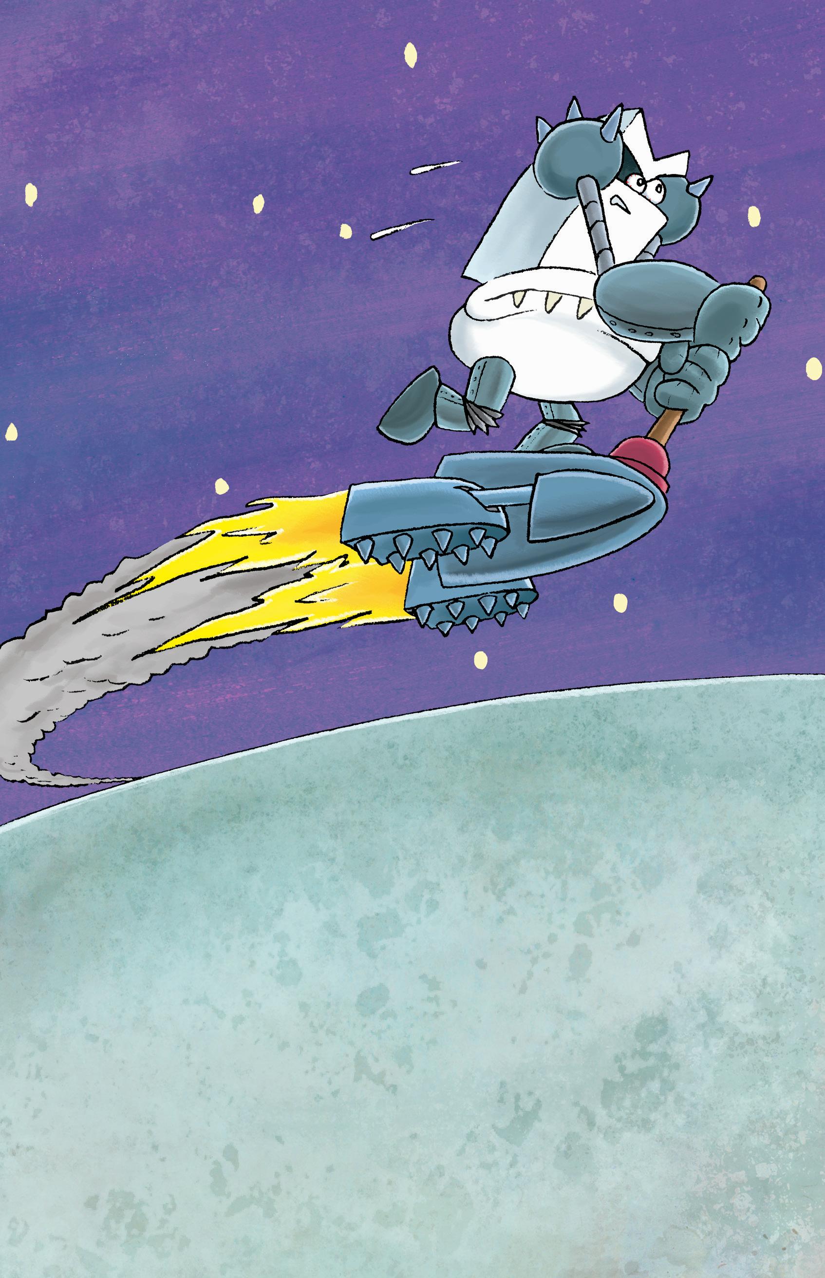 Gelukkig voor hem was hij een robot, dus hij wist het een en ander van werktuigkunde. Hij deed er niet lang over om de Opperplopper te demonteren, de onderdelen anders in elkaar te zetten en een vliegende raketscooter te maken van de oude delen van zijn aartsvijand.