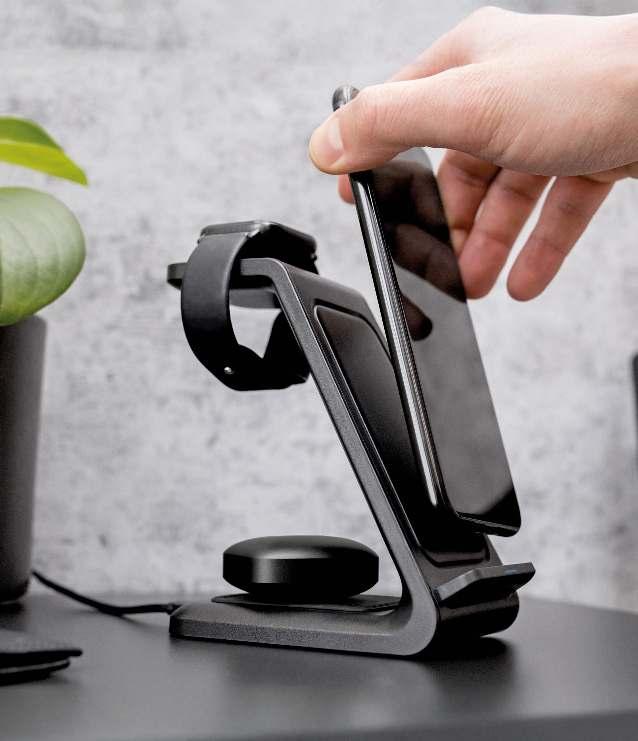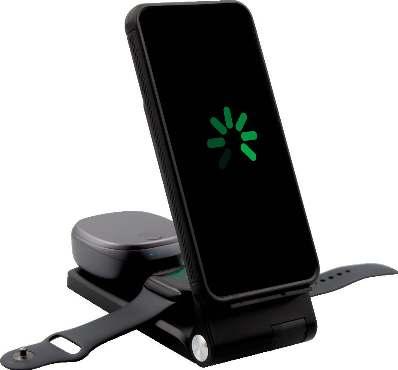 Exclusive Collection kabelloses Ladegerät 15W, 3 in 1, faltbarer Telefonständer, funktioniert mit Geräten mit induktiver Ladefunktion, 3 kabellose Ladespulen (15W, 3W, 2W), kann drei Geräte wie Smartwatches, Telefone und Kopfhörer gleichzeitig aufladen, Hintergrundbeleuchtungseffekt nach Gravur, USB-C Eingang, USB-C Kabel enthalten (1m), Produkt aus ABS 24,44EUR