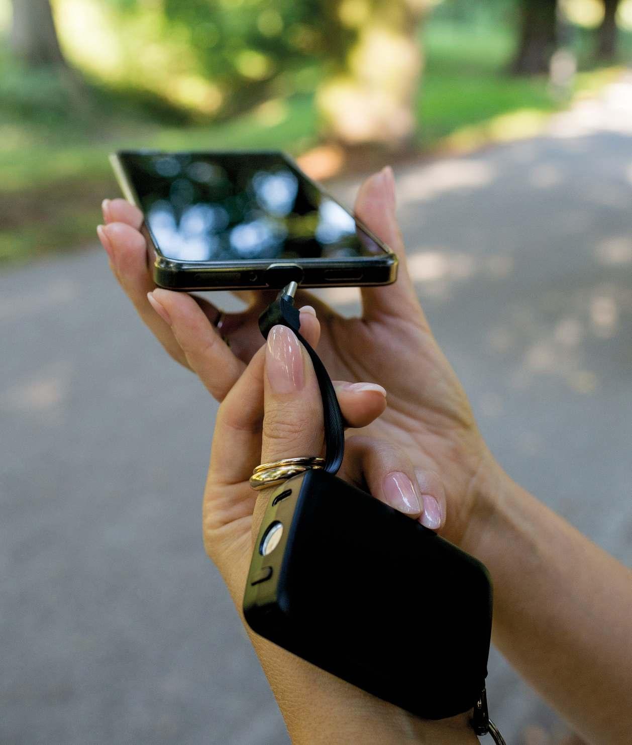 Powerbank 4000 mAh mit Karabiner zum Befestigen, passt in eine Tasche oder in die meisten Rucksackfächer, verfügt über ein eingebautes 1WLicht mit 3 Leuchtmodi: Lichtstrahl (2 Modi) und Blinklicht (SOS-Signal), 2 integrierte Kabel: USB-C und Spitze kompatibel mit iOS-Geräten, so dass Sie gleichzeitig zwei Geräte mit unterschiedlichen Anschlüssen aufladen können, verfügt über 4 Dioden, die den Energiestand anzeigen, Lampenbetriebszeit bei einem Ladezyklus der Powerbank: >24h, USB-C Eingang, inkl. USB-C Kabel, Produkt aus ABS und Metall