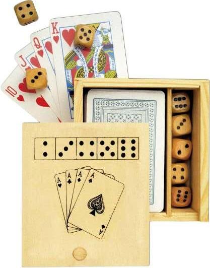 Zestaw upominkowy, piersiówka 175 ml, kieliszek 30 ml, szachy, karty oraz kości do gry, drewniane pudełko podarunkowe