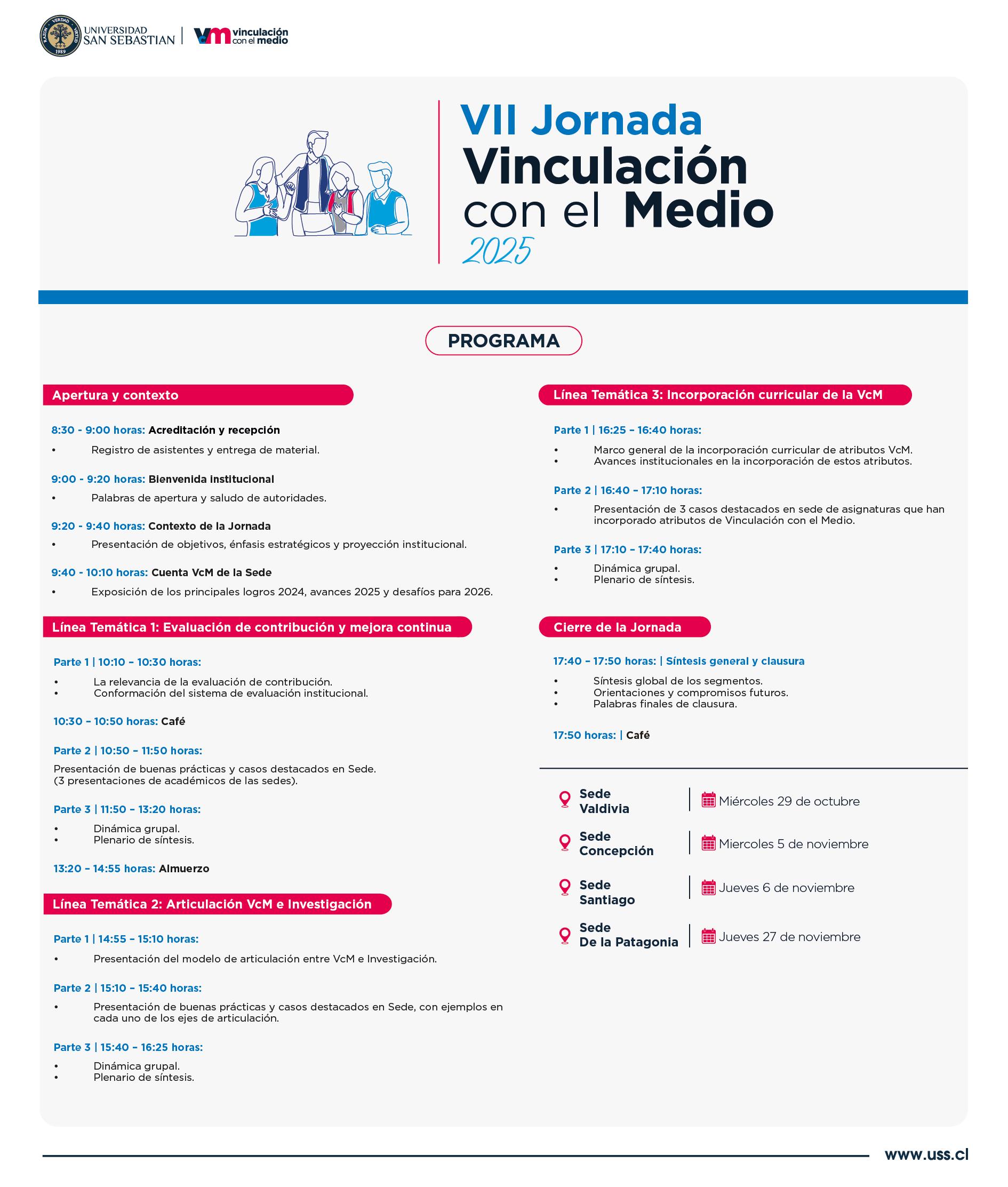 Esta publicación corresponde al registro de las VII Jornadas de Vinculación con el Medio realizadas en Valdivia, Concepción, Santiago y Puerto Montt, entre octubre y noviembre de 2025.