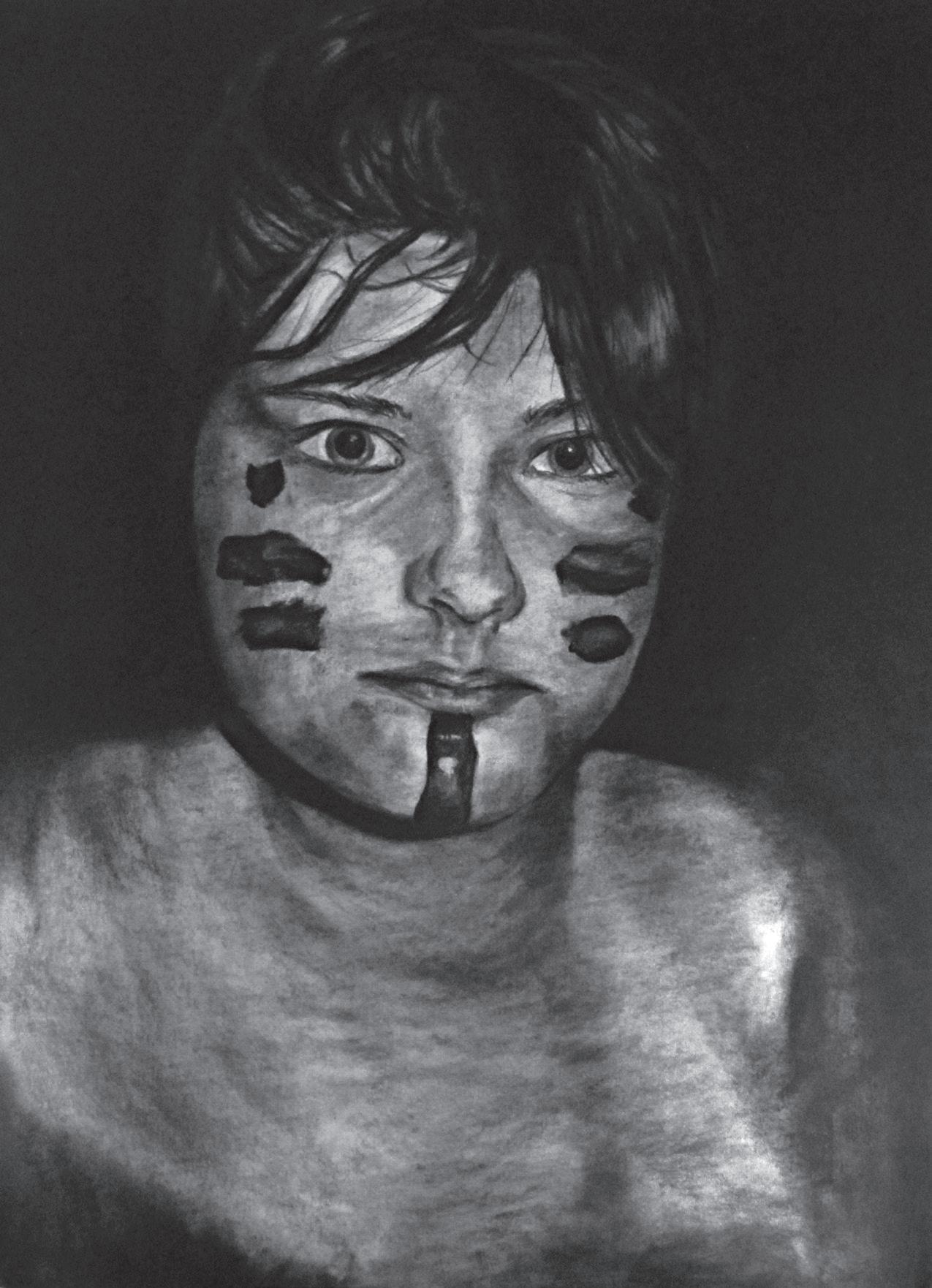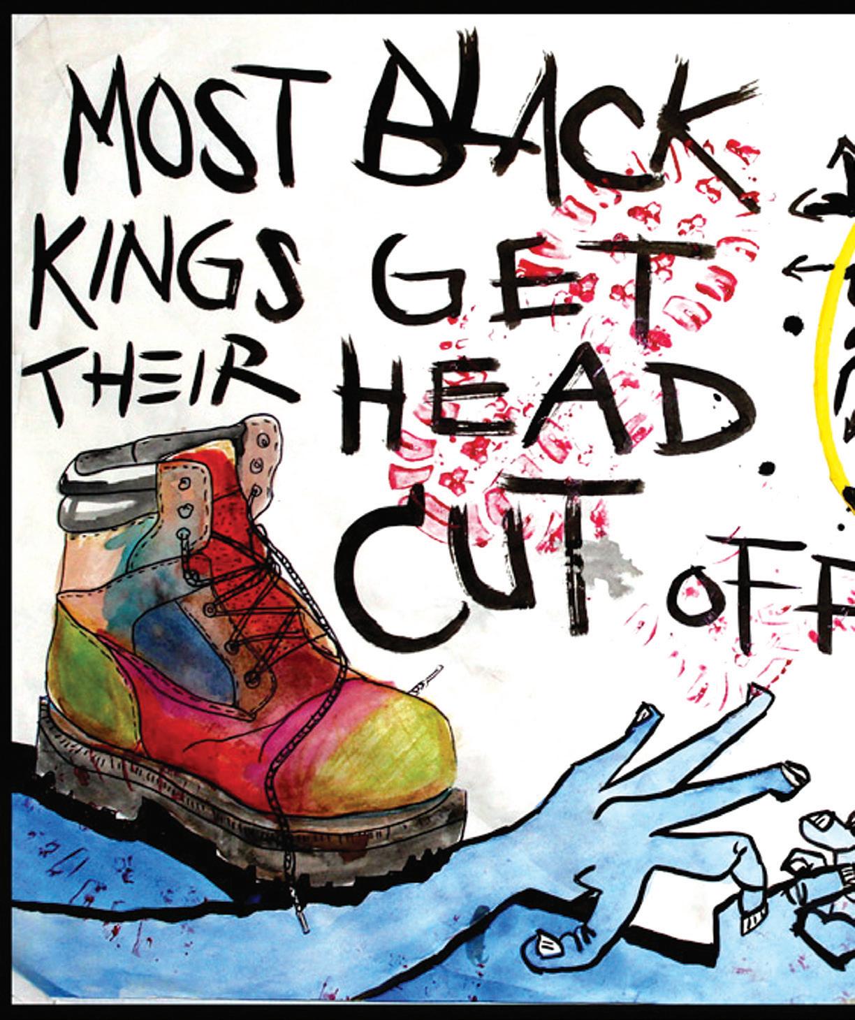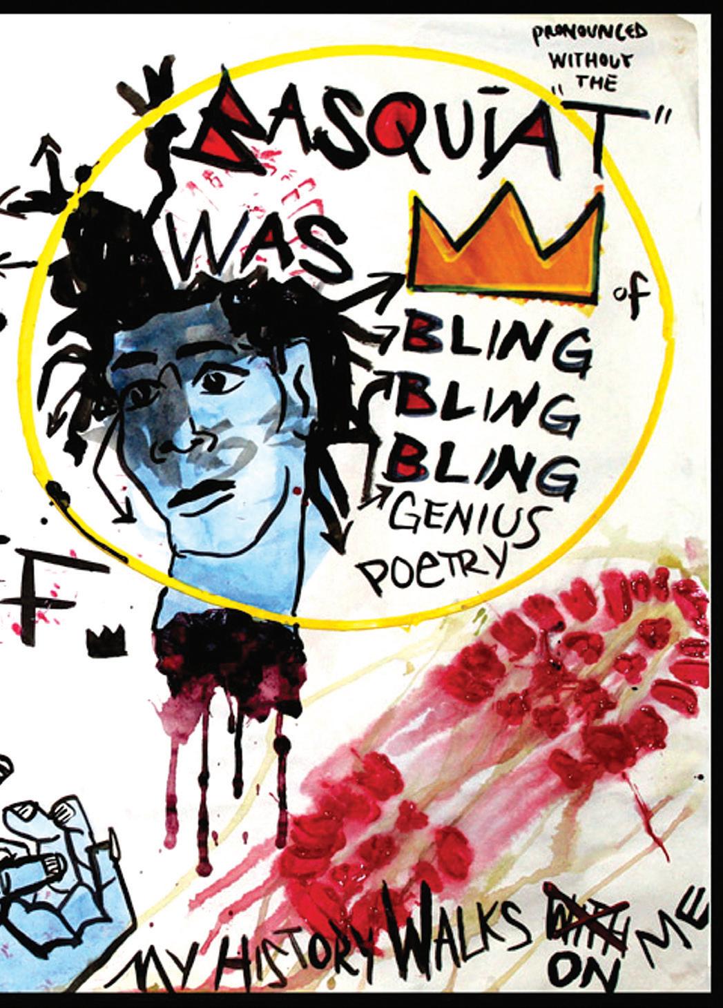He trips to school in the rain with an open back pack. His mama yells, “You forgot your hat!” But Blackboy doesn't look back. Blackboy runs mad. Blackboy runs late. Every classmate knows Blackboy shows up mad late. “Stop! No running in the hallway,” Ms. Whitelady says “What were you thinking? Use your head!” He says “Okaaaay” but does not understand. The rain rain goes away. Class goes out to play. Blackboy races the other boys on the steaming blacktop; a pack of Crayola girls watch from the shade, yelling “RUN, BLACKBOY RUN! YOU’RE AS BLACK AS THE BLACKTOP, STAY OUTTA THE SUN!” He screams “Shut up!” But their pointed fingers strike him down and their laughter becomes a suffocating thundercloud. Again, it pours; they go inside.
