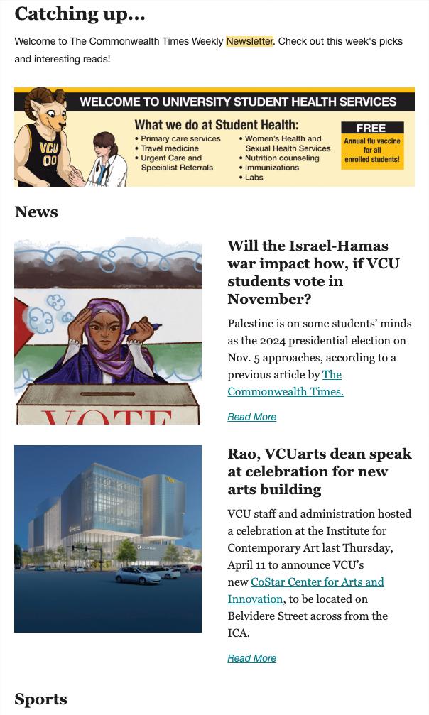 Richmond, as well as nationally in places like NPR, CNN, Axios and the Associated Press. The CT is a full-color newspaper, printed every other week on Wednesdays, distributed on and around campus and updated regularly online at commonwealthtimes.org.