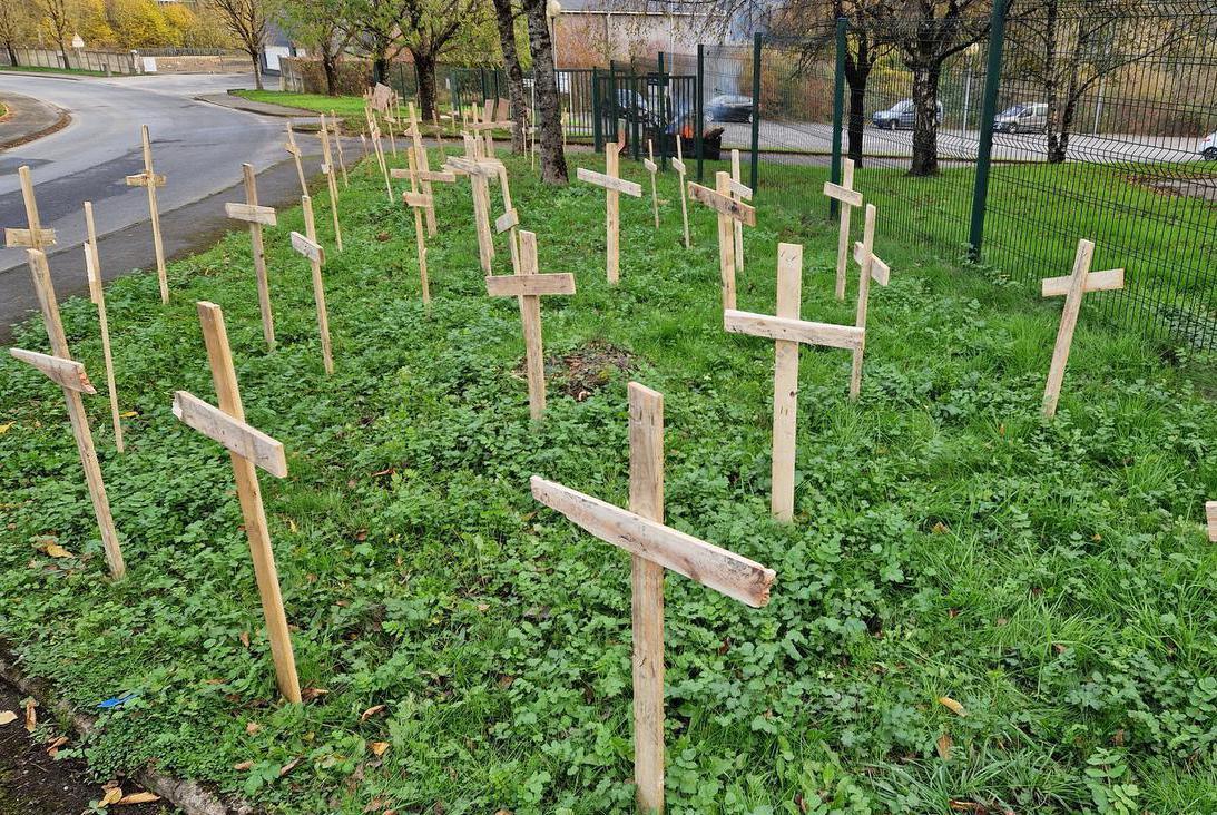 À BognysurMeuse (Ardennes), des salariés de Walor ont planté des croix devant leur entreprise, vendue à Forgex mais avec la reprise d’un tiers des effectifs seulement. Robinson Weber