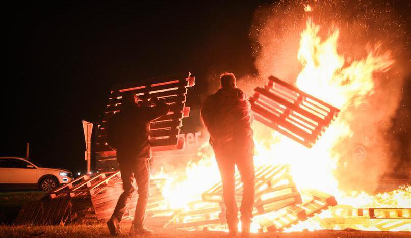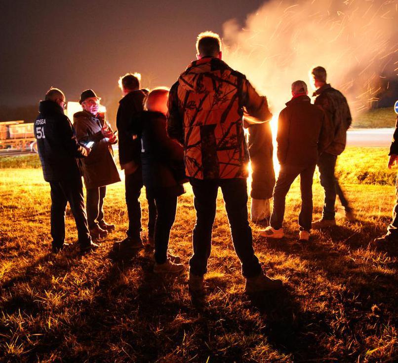 Un rondpoint, des tracteurs et un grand feu de l’enfer, ce mercredi en fin d’aprèsmidi près de l’aérodrome de ReimsPrunay. Il éclaire les visages graves d’une petite quarantaine d’agriculteurs, qu’automobilistes et chauffeurs routiers encouragent en klaxonnant quand ils arrivent à leur niveau.