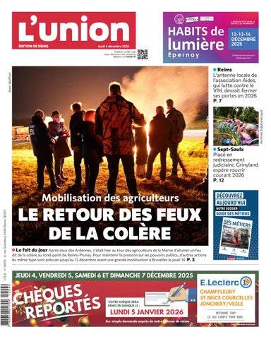 Le fait du jour Après ceux des Ardennes, c’était hier au tour des agriculteurs de la Marne d’allumer un feu dit de la colère au rondpoint de ReimsPrunay. Pour maintenir la pression sur les pouvoirs publics, d’autres actions du même type sont prévues jusqu’au 12 décembre avant une grande mobilisation à Bruxelles le jeudi 18. P. 3