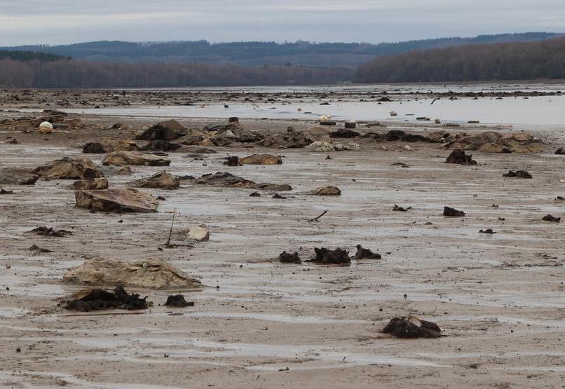 C’est un drôle de paysage qu’offre le lac artificiel des Vieilles Forges lorsqu’il est vidé de son eau. Telle une triste plage de Bretagne à marée basse qui attend l’hiver, les tons monochromes usent le regard, et le moral! Le froid s’est installé, le vent aussi, même les racines et autres caillasses semblent plantées là, juste pour nous titiller le blues. Heureusement, il suffit de jeter un œil sur les oiseaux de toutes sortes qui vivent là, pour se remettre un peu de baume au cœur!