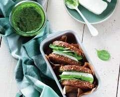 Tartiner chaque tranche de pain de pesto de roquette, ajouter une généreuse tranche de palet de chèvre frais et quelques morceaux d’avocat ainsi que des pousses d’épinards. Refermer chaque sandwich.