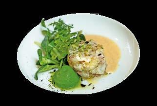 « Et voilà, un parfait chaud-froid réconfortant. » Le tartare est emporte-piéce au centre de l’assiette, la sauce servie à part. Une salade de mâche, « simplement tombée dans un beurre assaisonné avec un peu de muscade, légèrement tiède » accompagnera cette entrée, « mais j’aurais aussi pu choisir du cresson de la région. Ça marche aussi ». Et pour le petit truc en plus : un gel d’herbes et un zeste de citron noir d’Iran.